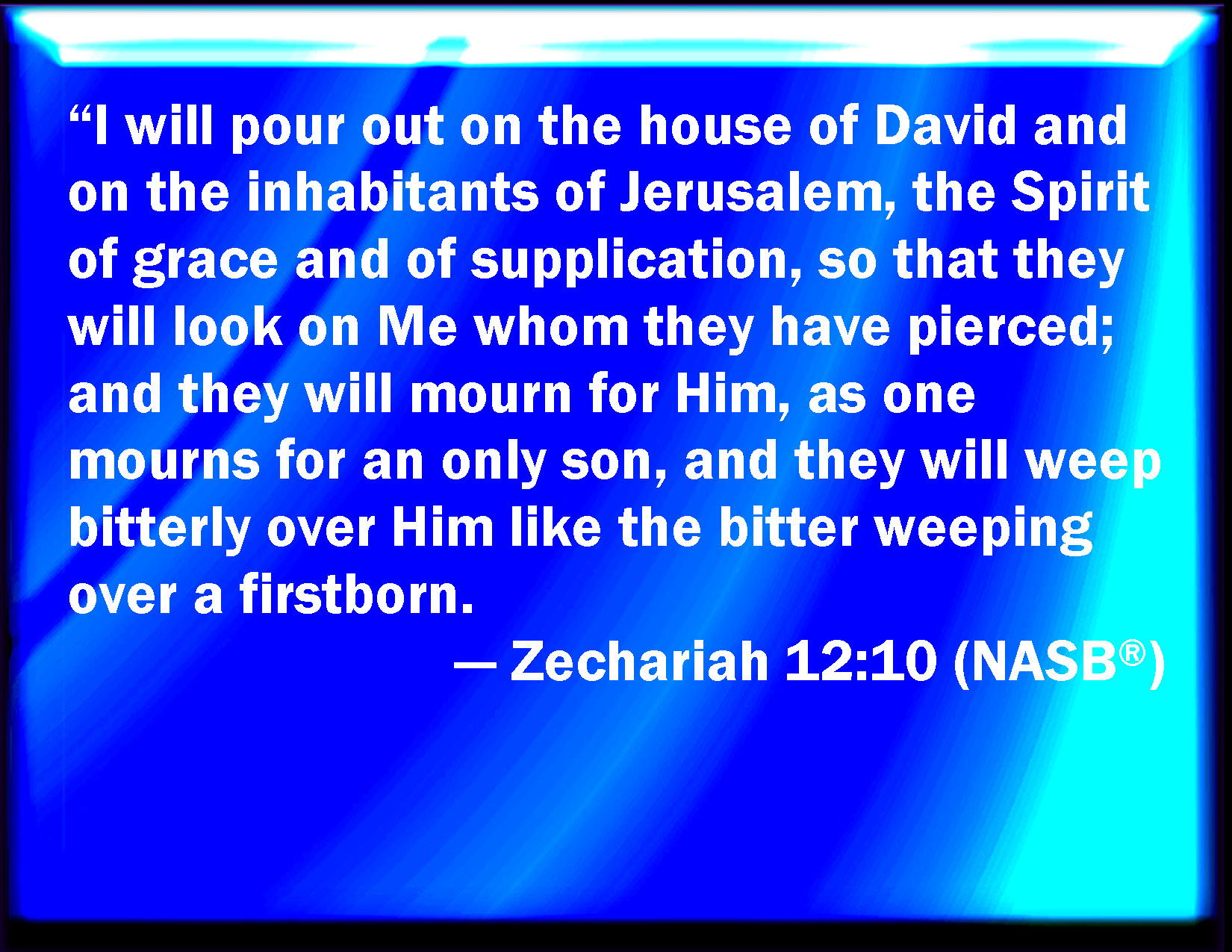 Bible Verse Slide Zechariah 12:10 And I will pour on the house of David, and on the inhabitants of Jerusalem, the spirit of grace and of supplications: and they shall look on me whom they have pierced, and they shall mourn for him, as one mourns for his only son, and shall be in bitterness for him, as one that is in bitterness for his firstborn. KJV: And I will pour upon the house of David, and upon the inhabitants of Jerusalem, the spirit of grace and of supplications: and they shall look upon me whom they have pierced, and they shall mourn for him, as one mourneth for his only son, and shall be in bitterness for him, as one that is in bitterness for his firstborn. DRB: And I will pour out upon the house of David, and upon the inhabitants of Jerusalem, the spirit of grace, and of prayers: and they shall look upon me, whom they have pierced: and they shall mourn for him as one mourneth for an only son, and they shall grieve over him, as the manner is to grieve for the death of the firstborn. DBT: And I will pour upon the house of David and upon the inhabitants of Jerusalem the spirit of grace and of supplications; and they shall look on me whom they pierced, and they shall mourn for him, as one mourneth for an only son, and shall be in bitterness for him, as one that is in bitterness for his firstborn. ERV: And I will pour upon the house of David, and upon the inhabitants of Jerusalem, the spirit of grace and of supplication; and they shall look unto me whom they have pierced: and they shall mourn for him, as one mourneth for his only son, and shall be in bitterness for him, as one that is in bitterness for his firstborn. WBT: And I will pour upon the house of David, and upon the inhabitants of Jerusalem, the spirit of grace and of supplications: and they shall look upon me whom they have pierced, and they shall mourn for him, as one mourneth for his only son, and shall be in bitterness for him, as one that is in bitterness for his first-born. WEB: I will pour on the house of David, and on the inhabitants of Jerusalem, the spirit of grace and of supplication; and they will look to me whom they have pierced; and they shall mourn for him, as one mourns for his only son, and will grieve bitterly for him, as one grieves for his firstborn. YLT: And I have poured on the house of David, And on the inhabitant of Jerusalem, A spirit of grace and supplications, And they have looked unto Me whom they pierced, And they have mourned over it, Like a mourning over the only one, And they have been in bitterness for it, Like a bitterness over the first-born.Links Zechariah 12:10 NIV • Zechariah 12:10 NLT • Zechariah 12:10 ESV • Zechariah 12:10 NASB • Zechariah 12:10 KJV • Zechariah 12:10 Interlinear • Zechariah 12:10 Commentaries • Zechariah 12:10 Parallel Texts • Zechariah 12:10 Bible Apps • Zechariah 12:10 Parallel • Bible Hub |