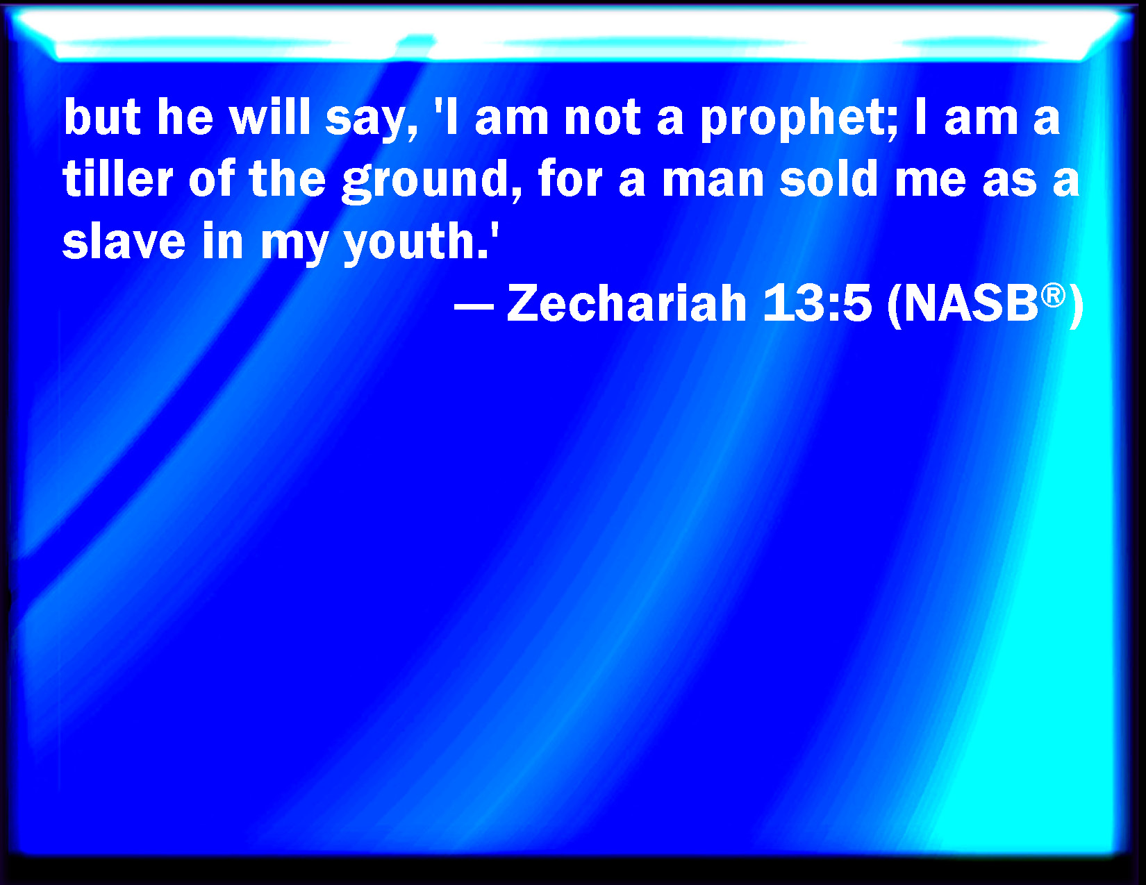Bible Verse Slide Zechariah 13:5 But he shall say, I am no prophet, I am an farmer; for man taught me to keep cattle from my youth. KJV: But he shall say, I am no prophet, I am an husbandman; for man taught me to keep cattle from my youth. DRB: But he shall say: I am no prophet, I am a husbandman: for Adam is my ex- ample from my youth. DBT: And he shall say, I am no prophet, I am a tiller of the ground; for man acquired me as bondman from my youth. ERV: but he shall say, I am no prophet, I am a tiller of the ground; for I have been made a bondman from my youth. WBT: But he shall say, I am no prophet, I am a husbandman; for man taught me to keep cattle from my youth. WEB: but he will say, 'I am no prophet, I am a tiller of the ground; for I have been made a bondservant from my youth.' YLT: And one hath said, 'I am not a prophet, A man, a tiller of ground I am, For ground is my possession from my youth.'Links Zechariah 13:5 NIV • Zechariah 13:5 NLT • Zechariah 13:5 ESV • Zechariah 13:5 NASB • Zechariah 13:5 KJV • Zechariah 13:5 Interlinear • Zechariah 13:5 Commentaries • Zechariah 13:5 Parallel Texts • Zechariah 13:5 Bible Apps • Zechariah 13:5 Parallel • Bible Hub |