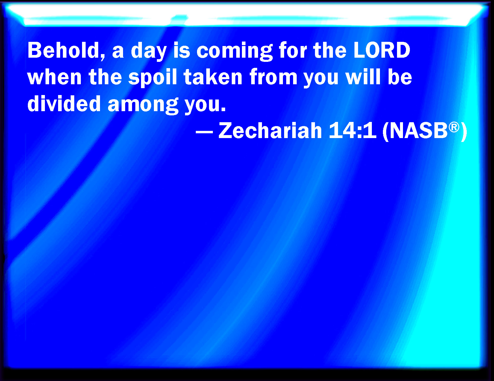 Bible Verse Slide Zechariah 14:1 Behold, the day of the LORD comes, and your spoil shall be divided in the middle of you. KJV: Behold, the day of the LORD cometh, and thy spoil shall be divided in the midst of thee. DRB: Behold the days of the Lord shall come, and thy spoils shall be divided in the midst of thee. DBT: Behold, the day cometh for Jehovah, and thy spoil shall be divided in the midst of thee. ERV: Behold, a day of the LORD cometh, when thy spoil shall be divided in the midst of thee. WBT: Behold, the day of the LORD cometh, and thy spoil shall be divided in the midst of thee. WEB: Behold, a day of Yahweh comes, when your spoil will be divided in your midst. YLT: Lo, a day hath come to Jehovah, And divided hath been thy spoil in thy midst.Links Zechariah 14:1 NIV • Zechariah 14:1 NLT • Zechariah 14:1 ESV • Zechariah 14:1 NASB • Zechariah 14:1 KJV • Zechariah 14:1 Interlinear • Zechariah 14:1 Commentaries • Zechariah 14:1 Parallel Texts • Zechariah 14:1 Bible Apps • Zechariah 14:1 Parallel • Bible Hub |
