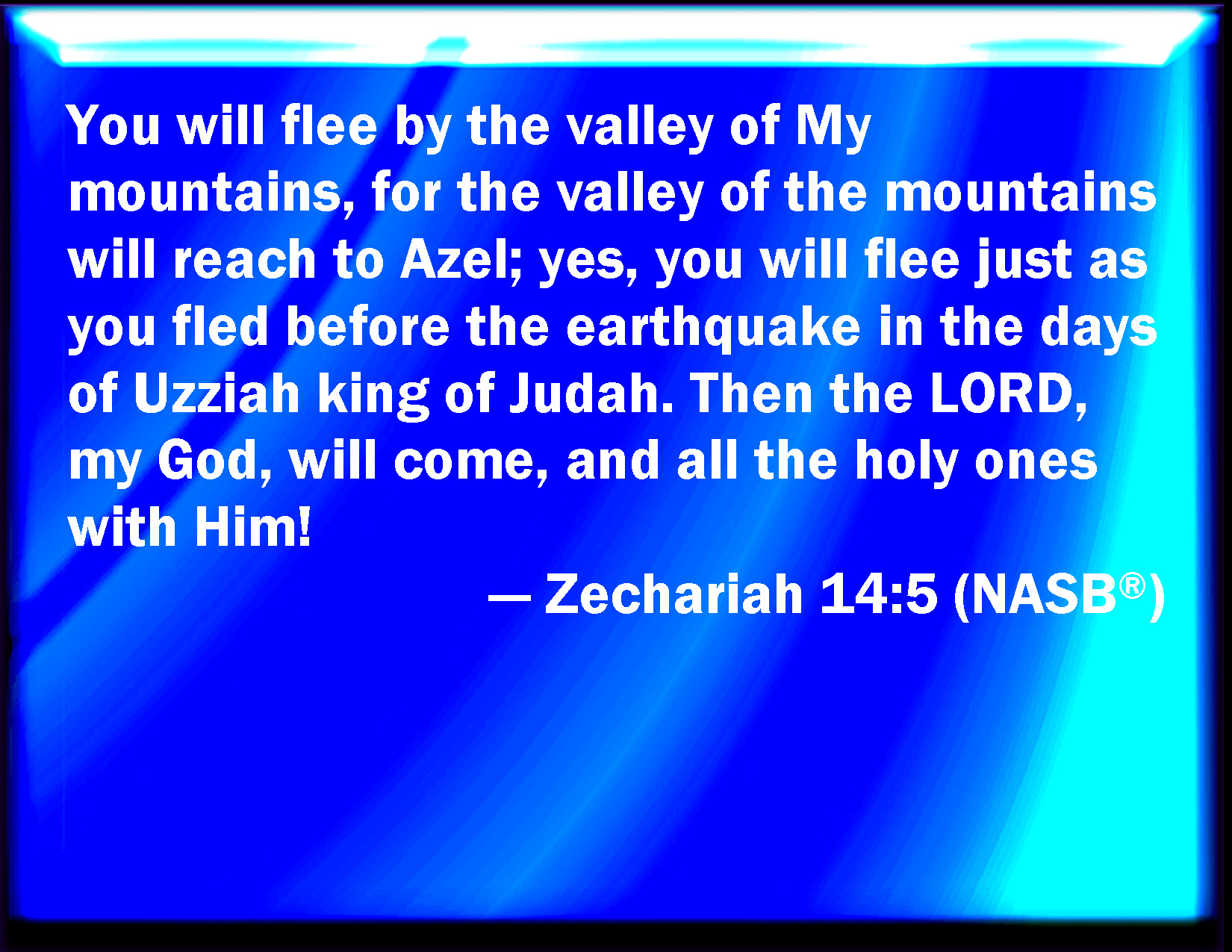 Zechariah 14:5 And you shall flee to the valley of the mountains; for the valley of the mountains shall reach to Azal: yes, you shall flee, like as you fled from before the earthquake in the days of Uzziah king of Judah: and the LORD my God shall come, and all the saints with you.