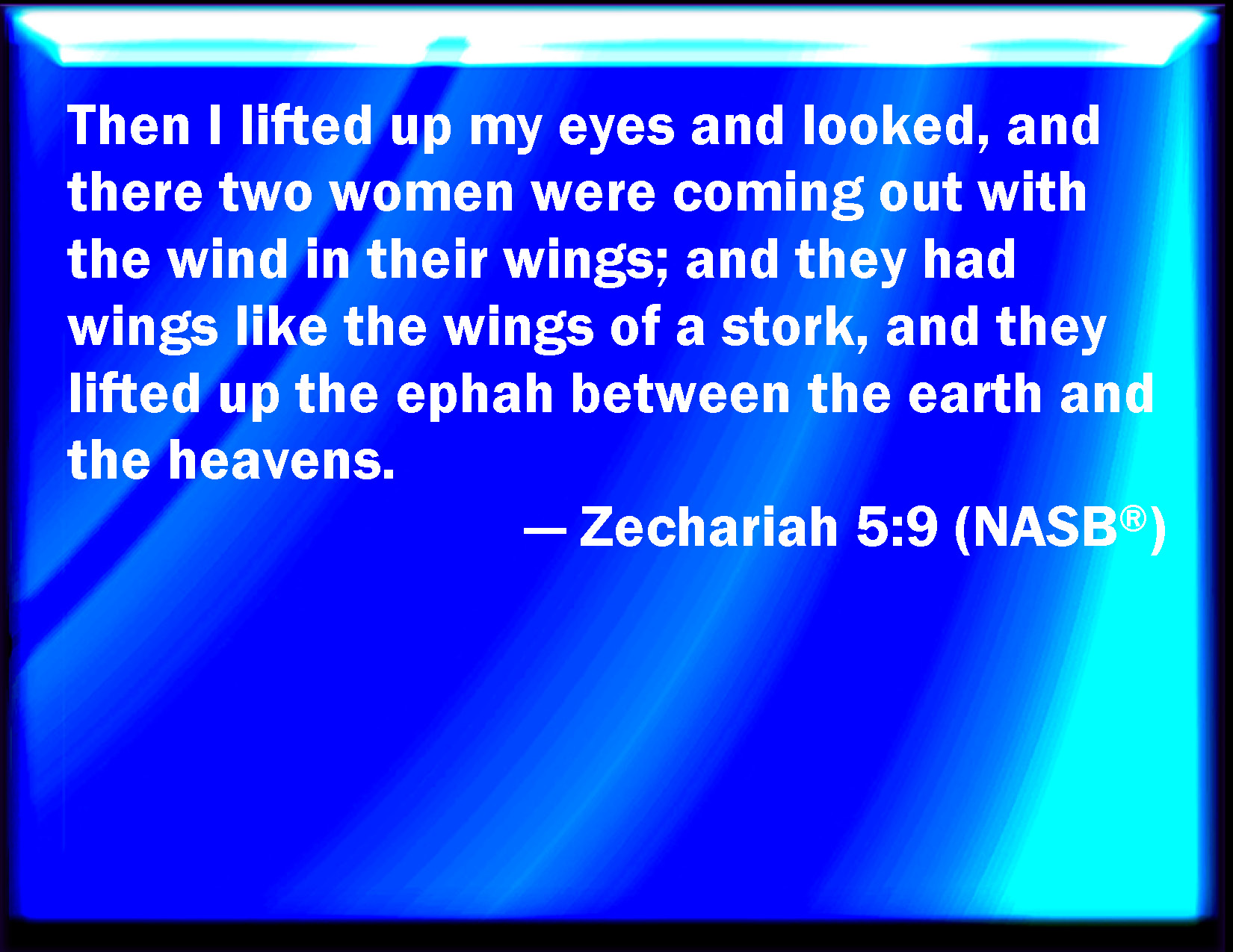 Bible Verse Slide Zechariah 5:9 Then lifted I up my eyes, and looked, and, behold, there came out two women, and the wind was in their wings; for they had wings like the wings of a stork: and they lifted up the ephah between the earth and the heaven. KJV: Then lifted I up mine eyes, and looked, and, behold, there came out two women, and the wind was in their wings; for they had wings like the wings of a stork: and they lifted up the ephah between the earth and the heaven. DRB: And I lifted up my eyes and looked: and behold there came out two women, and wind was in their wings, and they had wings like the wings of a kite: and they lifted up the vessel between the earth and the heaven. DBT: And I lifted up mine eyes, and saw, and behold, there came out two women, and the wind was in their wings; and they had wings like the wings of a stork; and they lifted up the ephah between the earth and the heavens. ERV: Then lifted I up mine eyes, and saw, and behold, there came forth two women, and the wind was in their wings; now they had wings like the wings of a stork: and they lifted up the ephah between the earth and the heaven. WBT: Then I lifted up my eyes, and looked and behold, there came out two women, and the wind was in their wings; for they had wings like the wings of a stork: and they lifted up the ephah between the earth and the heaven. WEB: Then lifted I up my eyes, and saw, and behold, there were two women, and the wind was in their wings. Now they had wings like the wings of a stork, and they lifted up the ephah basket between earth and the sky. YLT: And I lift up mine eyes, and see, and lo, two women are coming forth, and wind in their wings; and they have wings like wings of the stork, and they lift up the ephah between the earth and the heavens.Links Zechariah 5:9 NIV • Zechariah 5:9 NLT • Zechariah 5:9 ESV • Zechariah 5:9 NASB • Zechariah 5:9 KJV • Zechariah 5:9 Interlinear • Zechariah 5:9 Commentaries • Zechariah 5:9 Parallel Texts • Zechariah 5:9 Bible Apps • Zechariah 5:9 Parallel • Bible Hub |