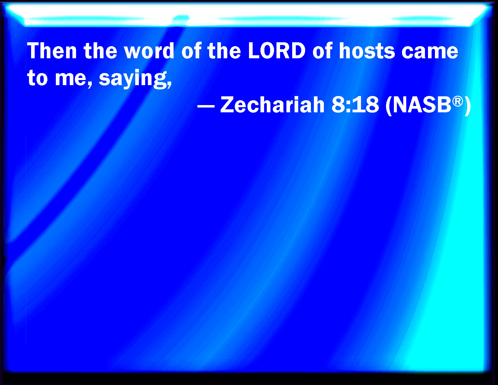 Bible Verse Slide Zechariah 8:18 And the word of the LORD of hosts came to me, saying, KJV: And the word of the LORD of hosts came unto me, saying, DRB: And the word of the Lord of hosts came to me, saying: DBT: And the word of Jehovah of hosts came unto me, saying, ERV: And the word of the LORD of hosts came unto me, saying, WBT: And the word of the LORD of hosts came to me, saying, WEB: The word of Yahweh of Armies came to me. YLT: And there is a word of Jehovah of Hosts unto me, saying:Links Zechariah 8:18 NIV • Zechariah 8:18 NLT • Zechariah 8:18 ESV • Zechariah 8:18 NASB • Zechariah 8:18 KJV • Zechariah 8:18 Interlinear • Zechariah 8:18 Commentaries • Zechariah 8:18 Parallel Texts • Zechariah 8:18 Bible Apps • Zechariah 8:18 Parallel • Bible Hub |