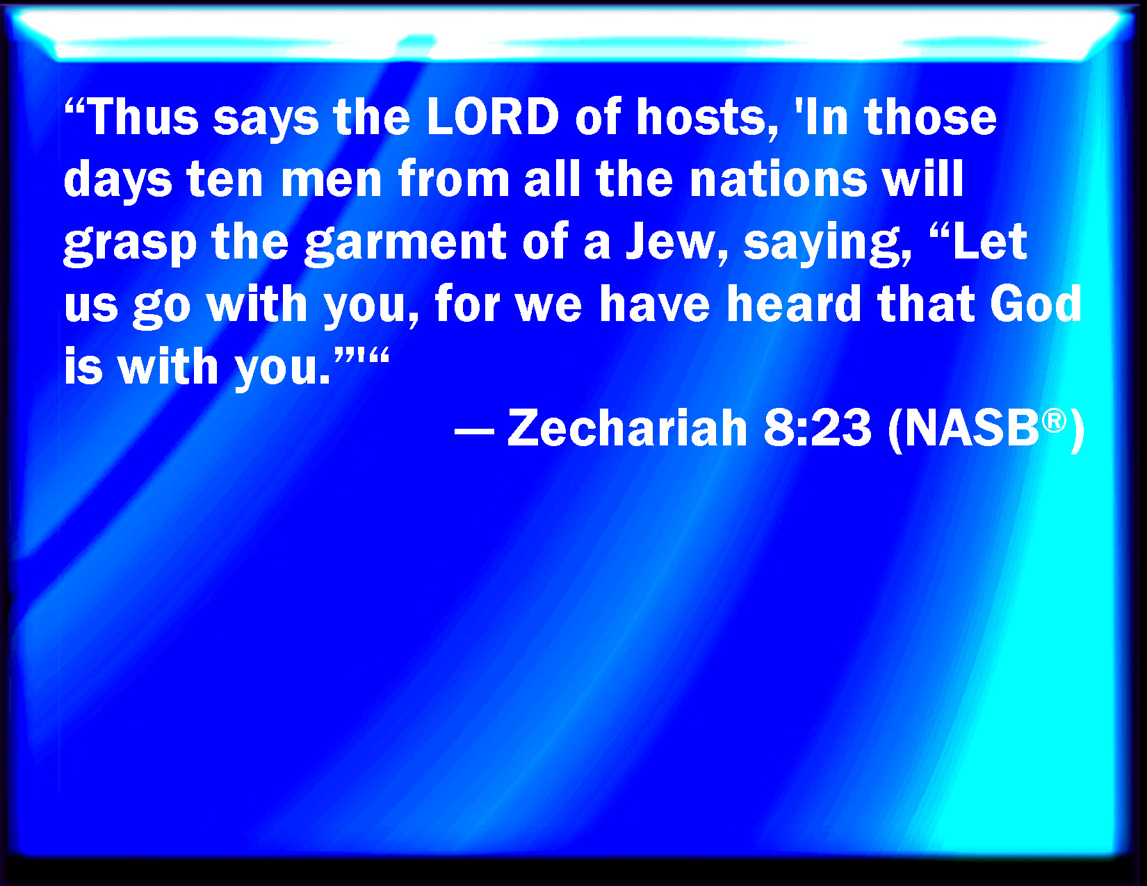 Bible Verse Slide Zechariah 8:23 Thus said the LORD of hosts; In those days it shall come to pass, that ten men shall take hold out of all languages of the nations, even shall take hold of the skirt of him that is a Jew, saying, We will go with you: for we have heard that God is with you. KJV: Thus saith the LORD of hosts; In those days it shall come to pass, that ten men shall take hold out of all languages of the nations, even shall take hold of the skirt of him that is a Jew, saying, We will go with you: for we have heard that God is with you. DRB: Thus saith the Lord of hosts : In those days, wherein ten men of all languages of the Gentiles shall take hold, and shall hold fast the shirt of one that is a Jew, saying: We will go with you: for we have heard that God is with you. DBT: Thus saith Jehovah of hosts: In those days shall ten men take hold, out of all languages of the nations, shall even take hold of the skirt of him that is a Jew, saying, We will go with you; for we have heard that God is with you. ERV: Thus saith the LORD of hosts: In those days it shall come to pass, that ten men shall take hold, out of all the languages of the nations, shall even take hold of the skirt of him that is a Jew, saying, We will go with you, for we have heard that God is with you. WBT: Thus saith the LORD of hosts: In those days it shall come to pass, that ten men out of all languages of the nations, shall take hold, shall even take hold of the skirt of him that is a Jew, saying, We will go with you: for we have heard that God is with you. WEB: Thus says Yahweh of Armies: "In those days, ten men will take hold, out of all the languages of the nations, they will take hold of the skirt of him who is a Jew, saying, 'We will go with you, for we have heard that God is with you.'" YLT: Thus said Jehovah of Hosts: In those days take hold do ten men of all languages of the nations, Yea, they have taken hold on the skirt of a man, a Jew, saying: We go with you, for we heard God is with you!Links Zechariah 8:23 NIV • Zechariah 8:23 NLT • Zechariah 8:23 ESV • Zechariah 8:23 NASB • Zechariah 8:23 KJV • Zechariah 8:23 Interlinear • Zechariah 8:23 Commentaries • Zechariah 8:23 Parallel Texts • Zechariah 8:23 Bible Apps • Zechariah 8:23 Parallel • Bible Hub |