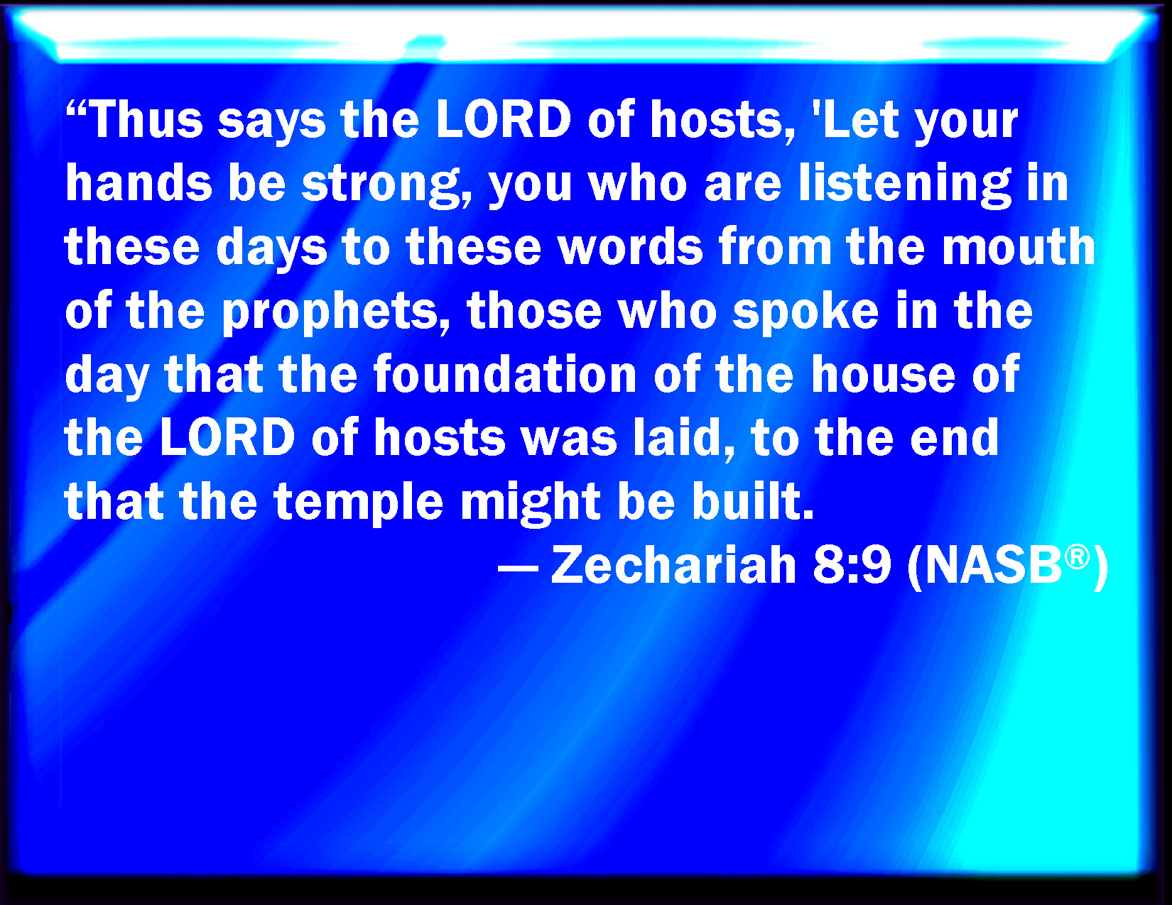 Bible Verse Slide Zechariah 8:9 Thus said the LORD of hosts; Let your hands be strong, you that hear in these days these words by the mouth of the prophets, which were in the day that the foundation of the house of the LORD of hosts was laid, that the temple might be built. KJV: Thus saith the LORD of hosts; Let your hands be strong, ye that hear in these days these words by the mouth of the prophets, which were in the day that the foundation of the house of the LORD of hosts was laid, that the temple might be built. DRB: Thus saith the Lord of hosts: Let your hands be strengthened, you that hear in these days these words by the mouth of the prophets, in the day that the house of the Lord of hosts was founded, that the temple might be built. DBT: Thus saith Jehovah of hosts: Let your hands be strong, ye that hear in these days these words by the mouth of the prophets, that were in the day that the foundation of the house of Jehovah of hosts was laid, that the temple might be built. ERV: Thus saith the LORD of hosts, Let your hands be strong, ye that hear in these days these words from the mouth of the prophets, which were in the day that the foundation of the house of the LORD of hosts was laid, even the temple, that it might be built. WBT: Thus saith the LORD of hosts; Let your hands be strong, ye that hear in these days these words by the mouth of the prophets, who were in the day when the foundation of the house of the LORD of hosts was laid, that the temple might be built. WEB: Thus says Yahweh of Armies: "Let your hands be strong, you who hear in these days these words from the mouth of the prophets who were in the day that the foundation of the house of Yahweh of Armies was laid, even the temple, that it might be built. YLT: Thus said Jehovah of Hosts: Let your hands be strong, Ye who are hearing in these days these words from the mouth of the prophets, That in the day the house of Jehovah of Hosts Hath been founded, the temple is to be built.Links Zechariah 8:9 NIV • Zechariah 8:9 NLT • Zechariah 8:9 ESV • Zechariah 8:9 NASB • Zechariah 8:9 KJV • Zechariah 8:9 Interlinear • Zechariah 8:9 Commentaries • Zechariah 8:9 Parallel Texts • Zechariah 8:9 Bible Apps • Zechariah 8:9 Parallel • Bible Hub |