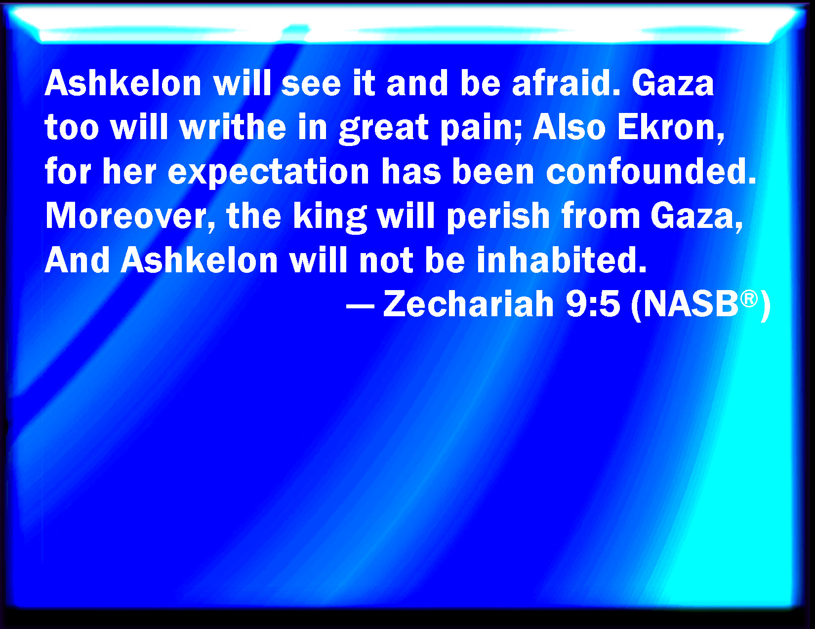 Bible Verse Slide Zechariah 9:5 Ashkelon shall see it, and fear; Gaza also shall see it, and be very sorrowful, and Ekron; for her expectation shall be ashamed; and the king shall perish from Gaza, and Ashkelon shall not be inhabited. KJV: Ashkelon shall see it, and fear; Gaza also shall see it, and be very sorrowful, and Ekron; for her expectation shall be ashamed; and the king shall perish from Gaza, and Ashkelon shall not be inhabited. DRB: Ascalon shall see, and shall fear, and Gaza, and shall be very sorrowful: and Accaron, because her hope is confounded : and the king shall perish from Gaza, and Ascalon shall not be inhabited. DBT: Ashkelon shall see it, and fear; Gazah also, and she shall be greatly pained; Ekron also, for her expectation shall be put to shame: and the king shall perish from Gazah, and Ashkelon shall not be inhabited. ERV: Ashkelon shall see it, and fear; Gaza also, and shall be sore pained; and Ekron, for her expectation shall be ashamed: and the king shall perish from Gaza, and Ashkelon shall not be inhabited. WBT: Ashkelon shall see it, and fear; Gaza also shall see it, and be very sorrowful, and Ekron; for her expectation shall be ashamed; and the king shall perish from Gaza, and Ashkelon shall not be inhabited. WEB: Ashkelon will see it, and fear; Gaza also, and will writhe in agony; as will Ekron, for her expectation will be disappointed; and the king will perish from Gaza, and Ashkelon will not be inhabited. YLT: See doth Ashkelon and fear, Also Gaza, and she is exceedingly pained, Also Ekron — for her expectation dried up, And perished hath a king from Gaza, And Ashkelon doth not remain,Links Zechariah 9:5 NIV • Zechariah 9:5 NLT • Zechariah 9:5 ESV • Zechariah 9:5 NASB • Zechariah 9:5 KJV • Zechariah 9:5 Interlinear • Zechariah 9:5 Commentaries • Zechariah 9:5 Parallel Texts • Zechariah 9:5 Bible Apps • Zechariah 9:5 Parallel • Bible Hub |