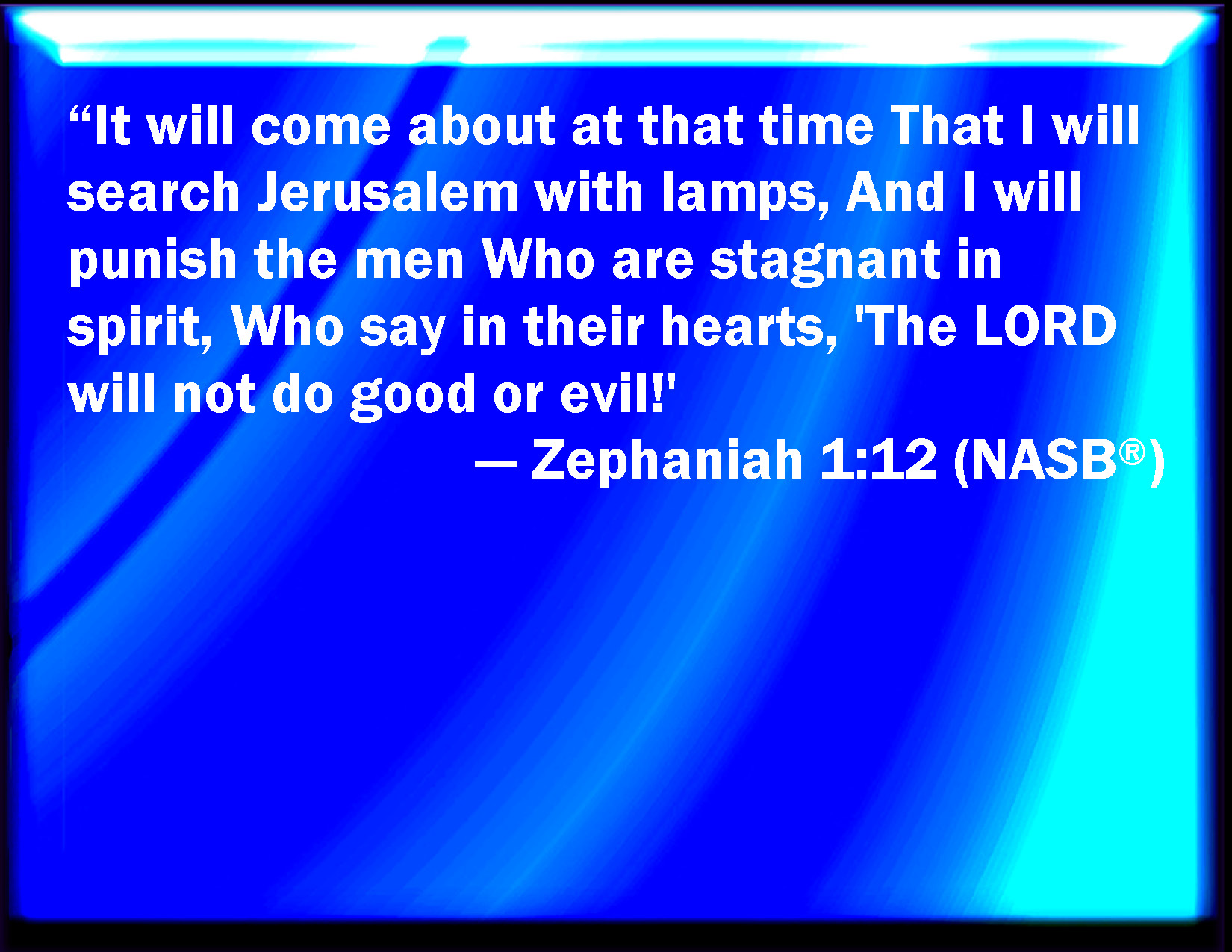 Bible Verse Slide Zephaniah 1:12 And it shall come to pass at that time, that I will search Jerusalem with candles, and punish the men that are settled on their lees: that say in their heart, The LORD will not do good, neither will he do evil. KJV: And it shall come to pass at that time, that I will search Jerusalem with candles, and punish the men that are settled on their lees: that say in their heart, The LORD will not do good, neither will he do evil. DRB: And it shall come to pass at that time, that I will search Jerusalem with lamps, and will visit upon the men that are settled on their lees: that say in their hearts: The Lord will not do good, nor will he do evil. DBT: And it shall come to pass at that time, that I will search Jerusalem with lamps, and punish the men that are settled on their lees, that say in their heart, Jehovah will not do good, neither will he do evil. ERV: And it shall come to pass at that time, that I will search Jerusalem with candles; and I will punish the men that are settled on their lees, that say in their heart, The LORD will not do good, neither will he do evil. WBT: And it shall come to pass at that time, that I will search Jerusalem with candles, and punish the men that are settled on their lees: that say in their heart, The LORD will not do good, neither will he do evil. WEB: It will happen at that time, that I will search Jerusalem with lamps, and I will punish the men who are settled on their dregs, who say in their heart, "Yahweh will not do good, neither will he do evil." YLT: And it hath come to pass, at that time, I search Jerusalem with lights, And I have laid a charge on the men Who are hardened on their preserved things, Who are saying in their heart: Jehovah doth no good, nor doth He evil.Links Zephaniah 1:12 NIV • Zephaniah 1:12 NLT • Zephaniah 1:12 ESV • Zephaniah 1:12 NASB • Zephaniah 1:12 KJV • Zephaniah 1:12 Interlinear • Zephaniah 1:12 Commentaries • Zephaniah 1:12 Parallel Texts • Zephaniah 1:12 Bible Apps • Zephaniah 1:12 Parallel • Bible Hub |