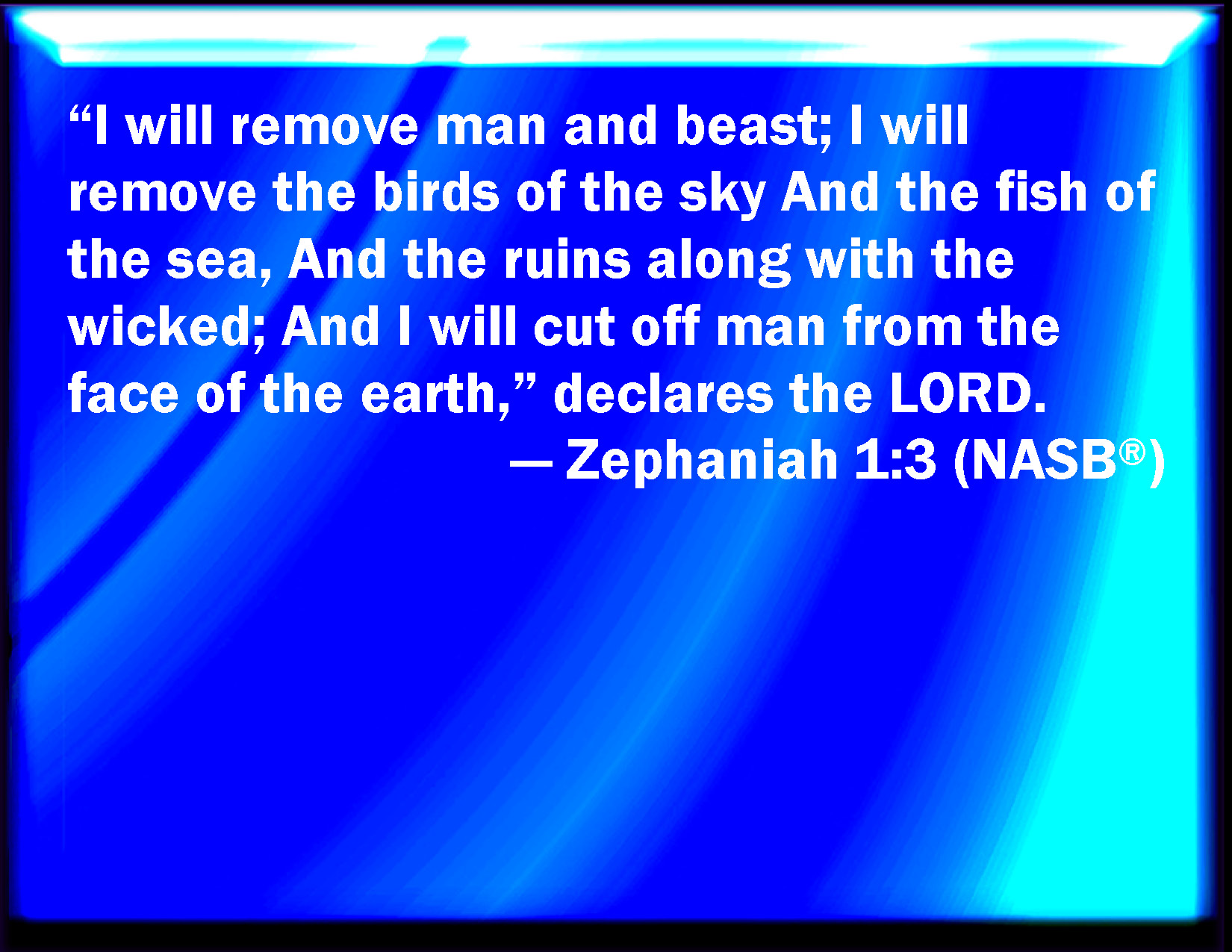 Bible Verse Slide Zephaniah 1:3 I will consume man and beast; I will consume the fowls of the heaven, and the fishes of the sea, and the stumbling blocks with the wicked: and I will cut off man from off the land, said the LORD. KJV: I will consume man and beast; I will consume the fowls of the heaven, and the fishes of the sea, and the stumblingblocks with the wicked; and I will cut off man from off the land, saith the LORD. DRB: I will gather man, and beast, I will gather the birds of the air, and the fishes of the sea: and the ungodly shall meet with ruin: and I will destroy men from off the face of the land, saith the Lord. DBT: I will take away man and beast; I will take away the fowl of the heavens and the fishes of the sea, and the stumbling-blocks with the wicked, and I will cut off mankind from off the face of the ground, saith Jehovah. ERV: I will consume man and beast; I will consume the fowls of the heaven, and the fishes of the sea, and the stumblingblocks with the wicked; and I will cut off man from off the face of the ground, saith the LORD. WBT: I will consume man and beast; I will consume the fowls of the heaven, and the fishes of the sea, and the stumbling-blocks with the wicked; and I will cut off man from off the land, saith the LORD. WEB: I will sweep away man and animal. I will sweep away the birds of the sky, the fish of the sea, and the heaps of rubble with the wicked. I will cut off man from the surface of the earth, says Yahweh. YLT: I consume man and beast, I consume fowl of the heavens, and fishes of the sea, And the stumbling-blocks — the wicked, And I have cut off man from the face of the ground, An affirmation of Jehovah,Links Zephaniah 1:3 NIV • Zephaniah 1:3 NLT • Zephaniah 1:3 ESV • Zephaniah 1:3 NASB • Zephaniah 1:3 KJV • Zephaniah 1:3 Interlinear • Zephaniah 1:3 Commentaries • Zephaniah 1:3 Parallel Texts • Zephaniah 1:3 Bible Apps • Zephaniah 1:3 Parallel • Bible Hub |