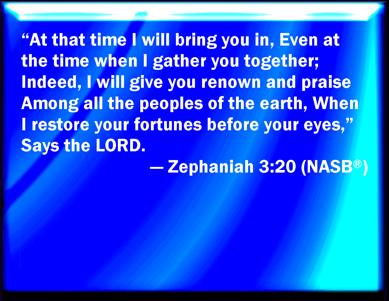 Bible Verse Slide Zephaniah 3:20 At that time will I bring you again, even in the time that I gather you: for I will make you a name and a praise among all people of the earth, when I turn back your captivity before your eyes, said the LORD. KJV: At that time will I bring you again, even in the time that I gather you: for I will make you a name and a praise among all people of the earth, when I turn back your captivity before your eyes, saith the LORD. DRB: At that time, when I will bring you: and at the time that I will gather you: for I will give you a name, and praise among all the people of the earth, when I shall have brought back your captivity before your eyes, saith the Lord. DBT: At that time will I bring you, yea, at the time that I gather you; for I will make you a name and a praise, among all the peoples of the earth, when I shall turn again your captivity before your eyes, saith Jehovah. ERV: At that time will I bring you in, and at that time will I gather you: for I will make you a name and a praise among all the peoples of the earth, when I bring again your captivity before your eyes, saith the LORD. WBT: At that time will I bring you again, even in the time that I gather you: for I will make you a name and a praise among all people of the earth, when I turn back your captivity before your eyes, saith the LORD. WEB: At that time will I bring you in, and at that time will I gather you; for I will give you honor and praise among all the peoples of the earth, when I restore your fortunes before your eyes, says Yahweh. YLT: At that time I bring you in, Even at the time of My assembling you, For I give you for a name, and for a praise, Among all peoples of the land, In My turning back to your captivity before your eyes, said Jehovah!Links Zephaniah 3:20 NIV • Zephaniah 3:20 NLT • Zephaniah 3:20 ESV • Zephaniah 3:20 NASB • Zephaniah 3:20 KJV • Zephaniah 3:20 Interlinear • Zephaniah 3:20 Commentaries • Zephaniah 3:20 Parallel Texts • Zephaniah 3:20 Bible Apps • Zephaniah 3:20 Parallel • Bible Hub |