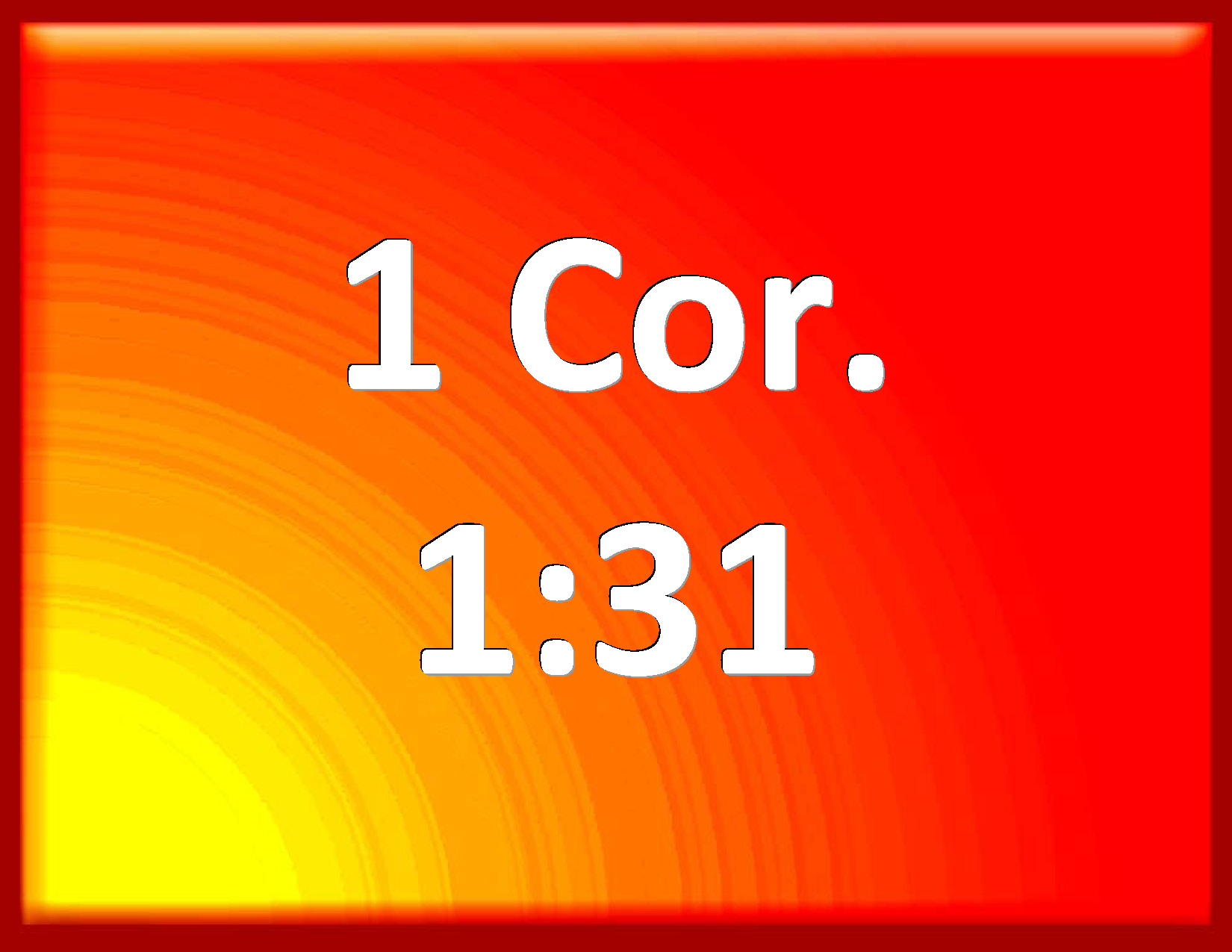 Bible Verse Slide 1 Corinthians 1:31 That, according as it is written, He that glories, let him glory in the Lord. KJV: That, according as it is written, He that glorieth, let him glory in the Lord. DRB: That, as it is written: He that glorieth, may glory in the Lord. DBT: that according as it is written, He that boasts, let him boast in the Lord. ERV: that, according as it is written, He that glorieth, let him glory in the Lord. WBT: That, according as it is written, He that glorieth, let him glory in the Lord. WEB: that, according as it is written, "He who boasts, let him boast in the Lord." YLT: that, according as it hath been written, 'He who is glorying — in the Lord let him glory.'Links 1 Corinthians 1:31 NIV • 1 Corinthians 1:31 NLT • 1 Corinthians 1:31 ESV • 1 Corinthians 1:31 NASB • 1 Corinthians 1:31 KJV • 1 Corinthians 1:31 Interlinear • 1 Corinthians 1:31 Commentaries • 1 Corinthians 1:31 Parallel Texts • 1 Corinthians 1:31 Bible Apps • 1 Corinthians 1:31 Parallel • Bible Hub |