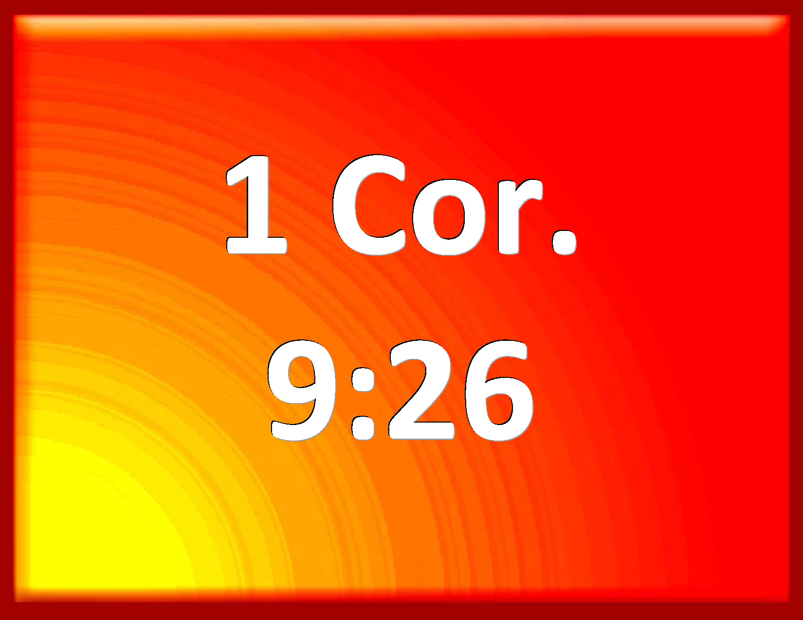 Bible Verse Slide 1 Corinthians 9:26 I therefore so run, not as uncertainly; so fight I, not as one that beats the air: KJV: I therefore so run, not as uncertainly; so fight I, not as one that beateth the air: DRB: I therefore so run, not as at an uncertainty: I so fight, not as one beating the air: DBT: I therefore thus run, as not uncertainly; so I combat, as not beating the air. ERV: I therefore so run, as not uncertainly; so fight I, as not beating the air: WBT: I therefore so run, not as uncertainly; so I fight, not as one that beateth the air: WEB: I therefore run like that, as not uncertainly. I fight like that, as not beating the air, YLT: I, therefore, thus run, not as uncertainly, thus I fight, as not beating air;Links 1 Corinthians 9:26 NIV • 1 Corinthians 9:26 NLT • 1 Corinthians 9:26 ESV • 1 Corinthians 9:26 NASB • 1 Corinthians 9:26 KJV • 1 Corinthians 9:26 Interlinear • 1 Corinthians 9:26 Commentaries • 1 Corinthians 9:26 Parallel Texts • 1 Corinthians 9:26 Bible Apps • 1 Corinthians 9:26 Parallel • Bible Hub |