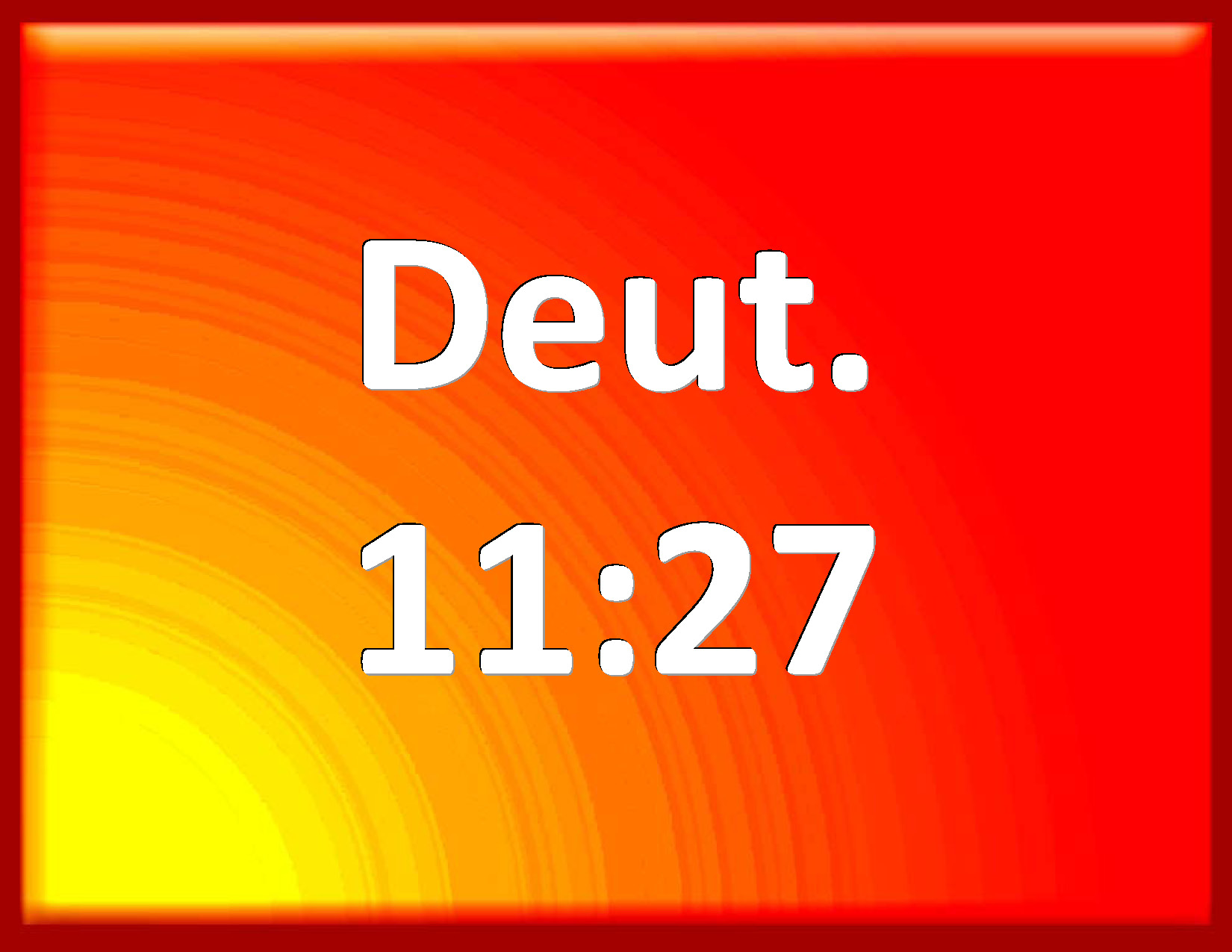 Bible Verse Slide Deuteronomy 11:27 A blessing, if you obey the commandments of the LORD your God, which I command you this day: KJV: A blessing, if ye obey the commandments of the LORD your God, which I command you this day: DRB: A blessing, if you obey the commandments of the Lord your God, which I command you this day: DBT: a blessing, if ye obey the commandments of Jehovah your God, which I command you this day; ERV: the blessing, if ye shall hearken unto the commandments of the LORD your God, which I command you this day: WBT: A blessing, if ye obey the commandments of the LORD your God which I command you this day; WEB: the blessing, if you shall listen to the commandments of Yahweh your God, which I command you this day; YLT: the blessing, when ye hearken unto the commands of Jehovah your God, which I am commanding you to-day;Links Deuteronomy 11:27 NIV • Deuteronomy 11:27 NLT • Deuteronomy 11:27 ESV • Deuteronomy 11:27 NASB • Deuteronomy 11:27 KJV • Deuteronomy 11:27 Interlinear • Deuteronomy 11:27 Commentaries • Deuteronomy 11:27 Parallel Texts • Deuteronomy 11:27 Bible Apps • Deuteronomy 11:27 Parallel • Bible Hub |