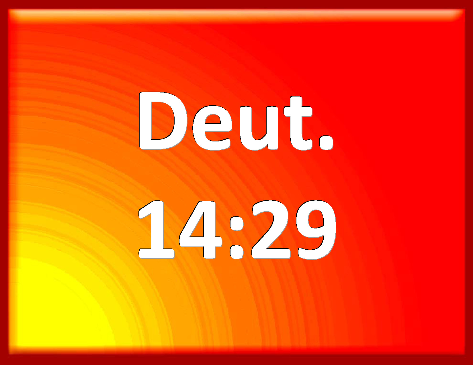 Bible Verse Slide Deuteronomy 14:29 And the Levite, (because he has no part nor inheritance with you,) and the stranger, and the fatherless, and the widow, which are within your gates, shall come, and shall eat and be satisfied; that the LORD your God may bless you in all the work of your hand which you do. KJV: And the Levite, (because he hath no part nor inheritance with thee,) and the stranger, and the fatherless, and the widow, which are within thy gates, shall come, and shall eat and be satisfied; that the LORD thy God may bless thee in all the work of thine hand which thou doest. DRB: And the Levite that hath no other part nor possession with thee, and the stranger and the fatherless and the widow, that are within thy gates, shall come and shall eat and be filled: that the Lord thy God may bless thee in all the works of thy hands that thou shalt do. DBT: and the Levite for he hath no portion nor inheritance with thee and the stranger, and the fatherless, and the widow, that are within thy gates, shall come, and shall eat and be satisfied; that Jehovah thy God may bless thee in all the work of thy hand which thou doest. ERV: and the Levite, because he hath no portion nor inheritance with thee, and the stranger, and the fatherless, and the widow, which are within thy gates, shall come, and shall eat and be satisfied; that the LORD thy God may bless thee in all the work of thine hand which thou doest. WBT: And the Levite, (because he hath no part nor inheritance with thee) and the stranger, and the fatherless, and the widow, who are within thy gates, shall come, and shall eat and be satisfied; that the LORD thy God may bless thee in all the work of thy hand which thou doest. WEB: and the Levite, because he has no portion nor inheritance with you, and the foreigner living among you, and the fatherless, and the widow, who are within your gates, shall come, and shall eat and be satisfied; that Yahweh your God may bless you in all the work of your hand which you do. YLT: and come in hath the Levite (for he hath no part and inheritance with thee), and the sojourner, and the fatherless, and the widow, who are within thy gates, and they have eaten, and been satisfied, so that Jehovah thy God doth bless thee in all the work of thy hand which thou dost.Links Deuteronomy 14:29 NIV • Deuteronomy 14:29 NLT • Deuteronomy 14:29 ESV • Deuteronomy 14:29 NASB • Deuteronomy 14:29 KJV • Deuteronomy 14:29 Interlinear • Deuteronomy 14:29 Commentaries • Deuteronomy 14:29 Parallel Texts • Deuteronomy 14:29 Bible Apps • Deuteronomy 14:29 Parallel • Bible Hub |