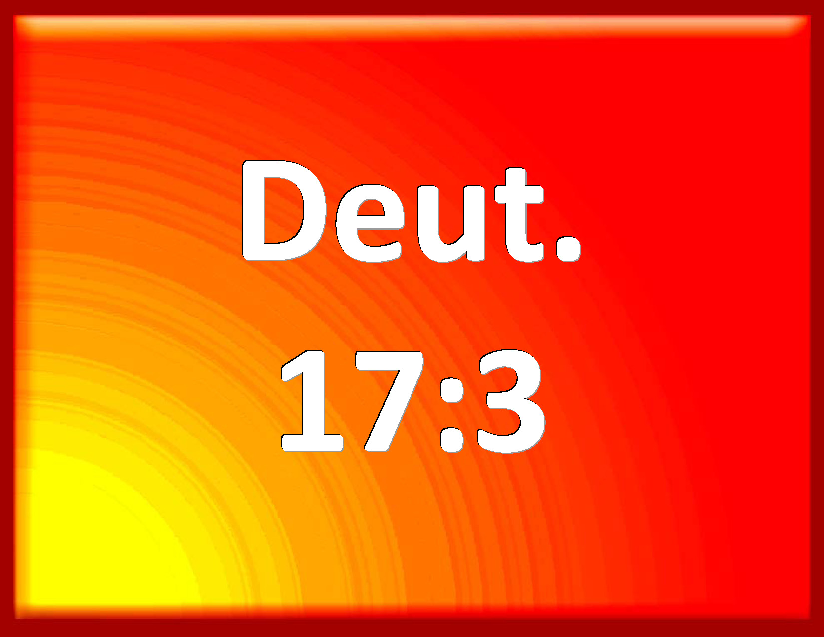 Bible Verse Slide Deuteronomy 17:3 And has gone and served other gods, and worshipped them, either the sun, or moon, or any of the host of heaven, which I have not commanded; KJV: And hath gone and served other gods, and worshipped them, either the sun, or moon, or any of the host of heaven, which I have not commanded; DRB: So as to go and serve strange gods, and adore them, the sun and the moon. and all the host of heaven, which I have not commanded: DBT: and goeth and serveth other gods, and boweth down to them, either to the sun or to the moon, or to the whole host of heaven, which I have not commanded; ERV: and hath gone and served other gods, and worshipped them, or the sun, or the moon, or any of the host of heaven, which I have not commanded; WBT: And hath gone and served other gods, and worshiped them, either the sun, or moon, or any of the host of heaven, which I have not commanded; WEB: and has gone and served other gods, and worshiped them, or the sun, or the moon, or any of the army of the sky, which I have not commanded; YLT: and he doth go and serve other gods, and doth bow himself to them, and to the sun, or to the moon, or to any of the host of the heavens, which I have not commanded — Links Deuteronomy 17:3 NIV • Deuteronomy 17:3 NLT • Deuteronomy 17:3 ESV • Deuteronomy 17:3 NASB • Deuteronomy 17:3 KJV • Deuteronomy 17:3 Interlinear • Deuteronomy 17:3 Commentaries • Deuteronomy 17:3 Parallel Texts • Deuteronomy 17:3 Bible Apps • Deuteronomy 17:3 Parallel • Bible Hub |