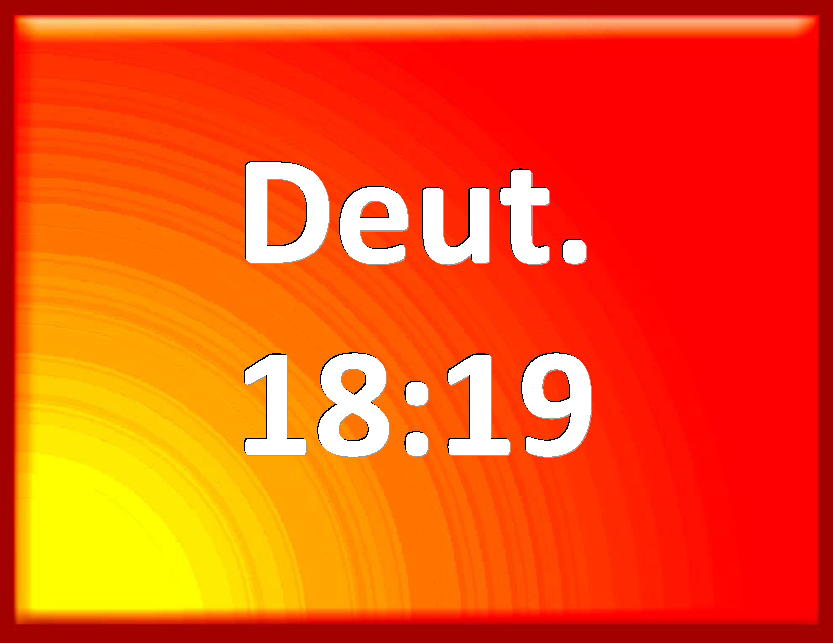 Bible Verse Slide Deuteronomy 18:19 And it shall come to pass, that whoever will not listen to my words which he shall speak in my name, I will require it of him. KJV: And it shall come to pass, that whosoever will not hearken unto my words which he shall speak in my name, I will require it of him. DRB: And he that will not hear his words, which he shall speak in my name, I will be the revenger. DBT: And it shall come to pass that the man who hearkeneth not unto my words which he shall speak in my name, I will require it of him. ERV: And it shall come to pass, that whosoever will not hearken unto my words which he shall speak in my name, I will require it of him. WBT: And it shall come to pass, that whoever will not hearken to my words which he shall speak in my name, I will require it of him. WEB: It shall happen, that whoever will not listen to my words which he shall speak in my name, I will require it of him. YLT: and it hath been — the man who doth not hearken unto My words which he doth speak in My name, I require it of him.Links Deuteronomy 18:19 NIV • Deuteronomy 18:19 NLT • Deuteronomy 18:19 ESV • Deuteronomy 18:19 NASB • Deuteronomy 18:19 KJV • Deuteronomy 18:19 Interlinear • Deuteronomy 18:19 Commentaries • Deuteronomy 18:19 Parallel Texts • Deuteronomy 18:19 Bible Apps • Deuteronomy 18:19 Parallel • Bible Hub |