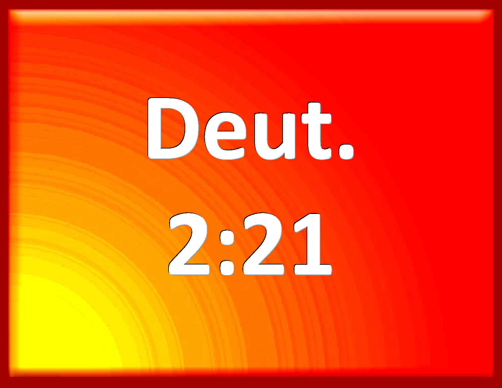 Bible Verse Slide Deuteronomy 2:21 A people great, and many, and tall, as the Anakims; but the LORD destroyed them before them; and they succeeded them, and dwelled in their stead: KJV: A people great, and many, and tall, as the Anakims; but the LORD destroyed them before them; and they succeeded them, and dwelt in their stead: DRB: A people great and many, and of tall stature, like the Enacims whom the Lord destroyed before their face: and he made them to dwell in their stead, DBT: a people great, and many, and tall as the Anakim; and Jehovah destroyed them before them, and they dispossessed them, and dwelt in their stead; ERV: a people great, and many, and tall, as the Anakim; but the LORD destroyed them before them; and they succeeded them, and dwelt in their stead: WBT: A people great, and many, and tall as the Anakims; but the LORD destroyed them before them; and they succeeded them, and dwelt in their stead: WEB: a people great, and many, and tall, as the Anakim; but Yahweh destroyed them before them; and they succeeded them, and lived in their place; YLT: a people great, and numerous, and tall, as the Anakim, and Jehovah destroyeth them before them, and they dispossess them, and dwell in their stead,Links Deuteronomy 2:21 NIV • Deuteronomy 2:21 NLT • Deuteronomy 2:21 ESV • Deuteronomy 2:21 NASB • Deuteronomy 2:21 KJV • Deuteronomy 2:21 Interlinear • Deuteronomy 2:21 Commentaries • Deuteronomy 2:21 Parallel Texts • Deuteronomy 2:21 Bible Apps • Deuteronomy 2:21 Parallel • Bible Hub |