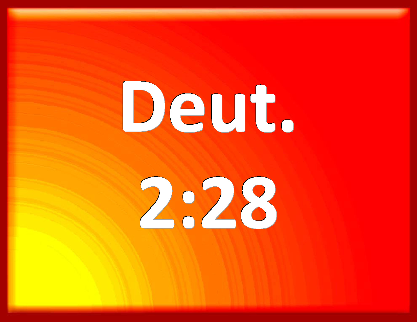 Bible Verse Slide Deuteronomy 2:28 You shall sell me meat for money, that I may eat; and give me water for money, that I may drink: only I will pass through on my feet; KJV: Thou shalt sell me meat for money, that I may eat; and give me water for money, that I may drink: only I will pass through on my feet; DRB: Sell us meat for money, that we may eat: give us water for money and so we will drink. We only ask that thou wilt let us pass through, DBT: Thou shalt sell me food for money that I may eat; and thou shalt give me water for money that I may drink; I will only pass through on my feet, ERV: Thou shalt sell me food for money, that I may eat; and give me water for money, that I may drink: only let me pass through on my feet; WBT: Thou shalt sell me food for money, that I may eat; and give me water for money, that I may drink: only I will pass through on my feet; WEB: You shall sell me food for money, that I may eat; and give me water for money, that I may drink: only let me pass through on my feet, YLT: food for money thou dost sell me, and I have eaten; and water for money thou dost give to me, and I have drunk; only, let me pass over on my feet, — Links Deuteronomy 2:28 NIV • Deuteronomy 2:28 NLT • Deuteronomy 2:28 ESV • Deuteronomy 2:28 NASB • Deuteronomy 2:28 KJV • Deuteronomy 2:28 Interlinear • Deuteronomy 2:28 Commentaries • Deuteronomy 2:28 Parallel Texts • Deuteronomy 2:28 Bible Apps • Deuteronomy 2:28 Parallel • Bible Hub |