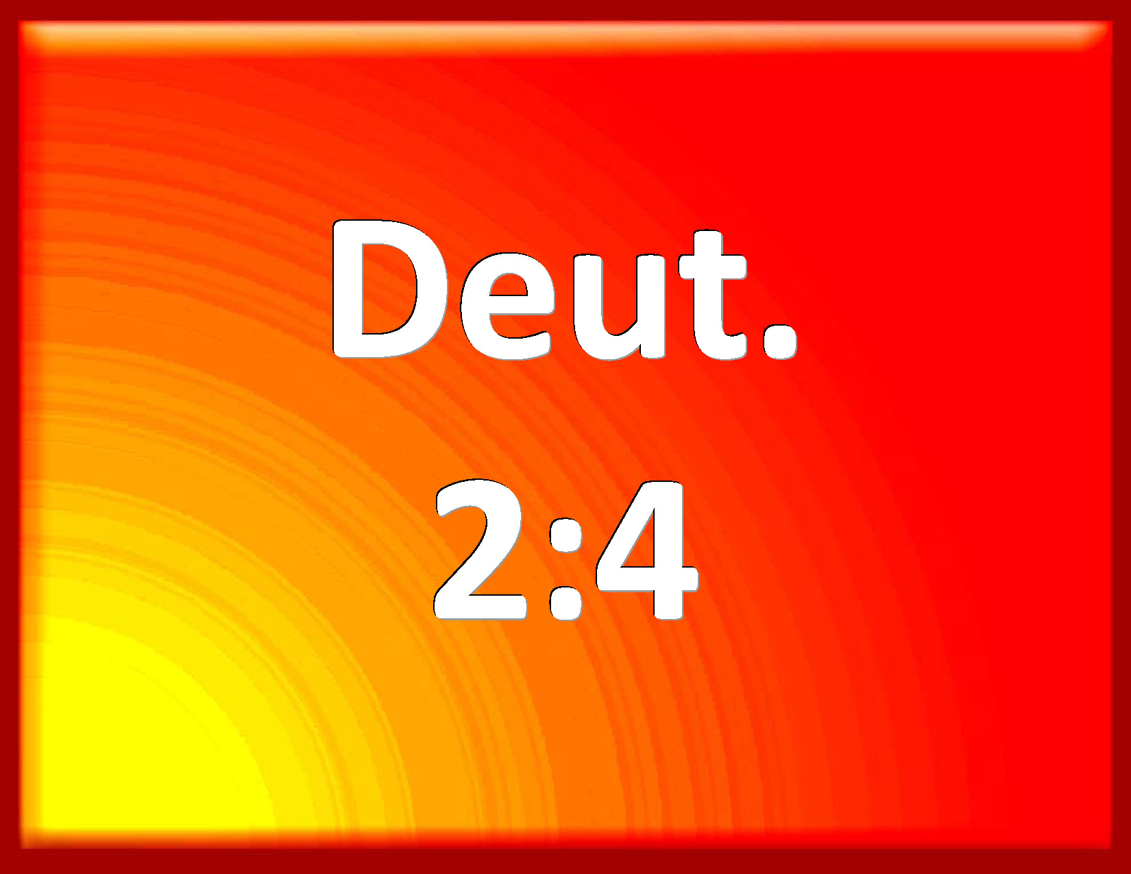 Bible Verse Slide Deuteronomy 2:4 And command you the people, saying, You are to pass through the coast of your brothers the children of Esau, which dwell in Seir; and they shall be afraid of you: take you good heed to yourselves therefore: KJV: And command thou the people, saying, Ye are to pass through the coast of your brethren the children of Esau, which dwell in Seir; and they shall be afraid of you: take ye good heed unto yourselves therefore: DRB: And command thou the people, saying: You shall pass by the borders of your brethren the children of Esau, who dwell in Seir, and they will be afraid of you. DBT: And command the people, saying, Ye are to pass through the border of your brethren the children of Esau, who dwell in Seir; and they will be afraid of you; and ye shall be very guarded: ERV: And command thou the people, saying, Ye are to pass through the border of your brethren the children of Esau, which dwell in Seir; and they shall be afraid of you: take ye good heed unto yourselves therefore: WBT: And command thou the people, saying, Ye are to pass through the border of your brethren the children of Esau, who dwell in Seir; and they will be afraid of you: therefore take ye good heed to yourselves: WEB: Command the people, saying, 'You are to pass through the border of your brothers the children of Esau, who dwell in Seir; and they will be afraid of you: take good heed to yourselves therefore; YLT: 'And the people command thou, saying, Ye are passing over into the border of your brethren, sons of Esau, who are dwelling in Seir, and they are afraid of you; and ye have been very watchful,Links Deuteronomy 2:4 NIV • Deuteronomy 2:4 NLT • Deuteronomy 2:4 ESV • Deuteronomy 2:4 NASB • Deuteronomy 2:4 KJV • Deuteronomy 2:4 Interlinear • Deuteronomy 2:4 Commentaries • Deuteronomy 2:4 Parallel Texts • Deuteronomy 2:4 Bible Apps • Deuteronomy 2:4 Parallel • Bible Hub |