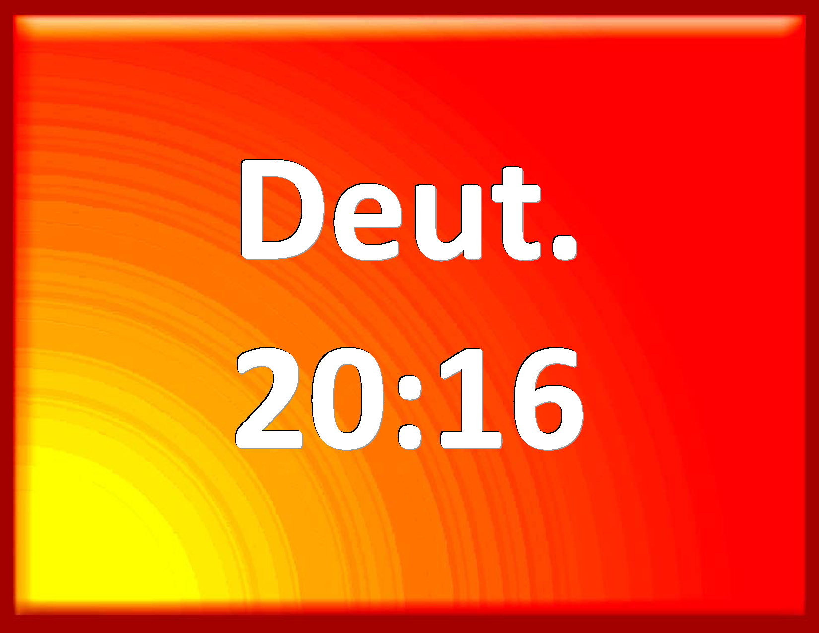 Bible Verse Slide Deuteronomy 20:16 But of the cities of these people, which the LORD your God does give you for an inheritance, you shall save alive nothing that breathes: KJV: But of the cities of these people, which the LORD thy God doth give thee for an inheritance, thou shalt save alive nothing that breatheth: DRB: But of those cities that shall be given thee, thou shalt suffer none at all to live: DBT: But of the cities of these peoples which Jehovah thy God giveth thee for an inheritance, thou shalt save alive nothing that breatheth, ERV: But of the cities of these peoples, which the LORD thy God giveth thee for an inheritance, thou shalt save alive nothing that breatheth: WBT: But of the cities of these people which the LORD thy God doth give thee for an inheritance, thou shalt save alive nothing that breatheth: WEB: But of the cities of these peoples, that Yahweh your God gives you for an inheritance, you shall save alive nothing that breathes; YLT: Only, of the cities of these peoples which Jehovah thy God is giving to thee for an inheritance, thou dost not keep alive any breathing;Links Deuteronomy 20:16 NIV • Deuteronomy 20:16 NLT • Deuteronomy 20:16 ESV • Deuteronomy 20:16 NASB • Deuteronomy 20:16 KJV • Deuteronomy 20:16 Interlinear • Deuteronomy 20:16 Commentaries • Deuteronomy 20:16 Parallel Texts • Deuteronomy 20:16 Bible Apps • Deuteronomy 20:16 Parallel • Bible Hub |