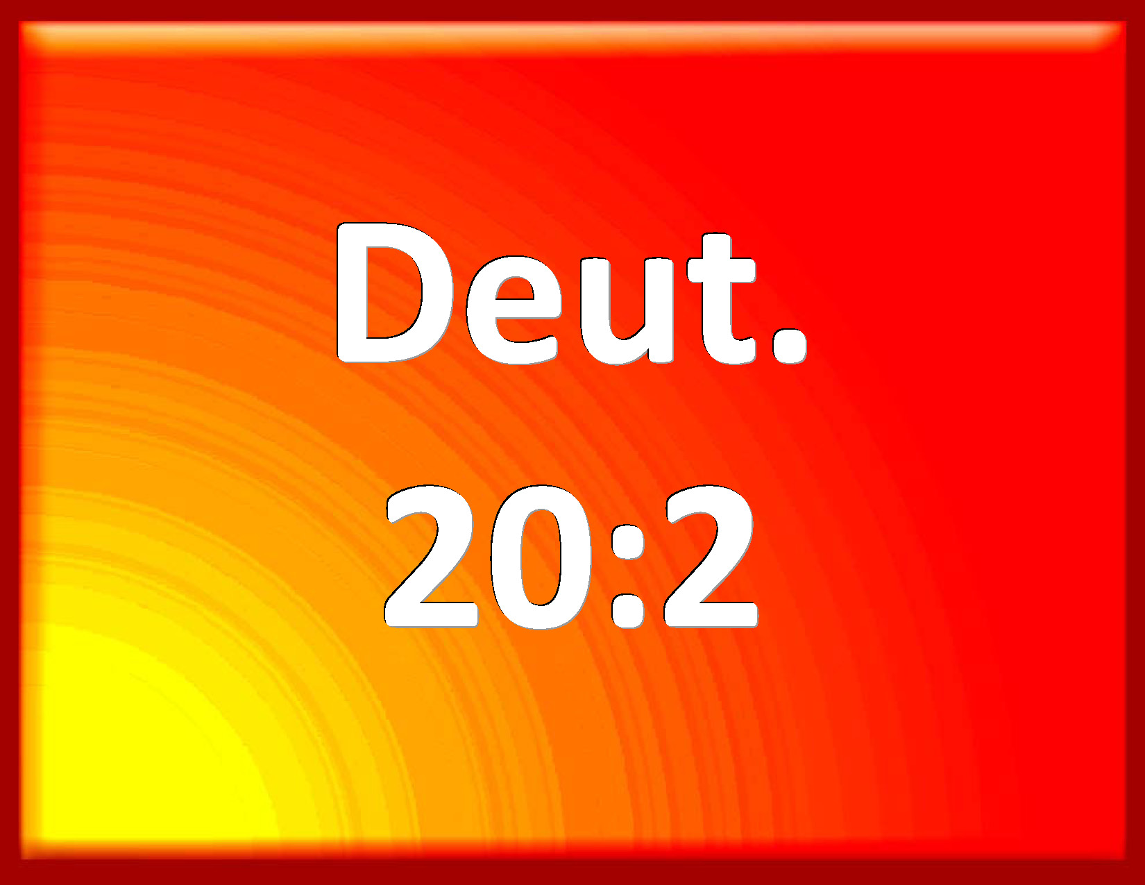 Bible Verse Slide Deuteronomy 20:2 And it shall be, when you are come near to the battle, that the priest shall approach and speak to the people, KJV: And it shall be, when ye are come nigh unto the battle, that the priest shall approach and speak unto the people, DRB: And when the battle is now at hand, the priest shall stand before the army, and shall speak to the people in this manner: DBT: And it shall be, when ye approach unto the battle, that the priest shall draw near and speak unto the people, ERV: And it shall be, when ye draw nigh unto the battle, that the priest shall approach and speak unto the people, WBT: And it shall be when ye are come nigh to the battle, that the priest shall approach and speak to the people, WEB: It shall be, when you draw near to the battle, that the priest shall approach and speak to the people, YLT: and it hath been, in your drawing near unto the battle, that the priest hath come nigh, and spoken unto the people,Links Deuteronomy 20:2 NIV • Deuteronomy 20:2 NLT • Deuteronomy 20:2 ESV • Deuteronomy 20:2 NASB • Deuteronomy 20:2 KJV • Deuteronomy 20:2 Interlinear • Deuteronomy 20:2 Commentaries • Deuteronomy 20:2 Parallel Texts • Deuteronomy 20:2 Bible Apps • Deuteronomy 20:2 Parallel • Bible Hub |