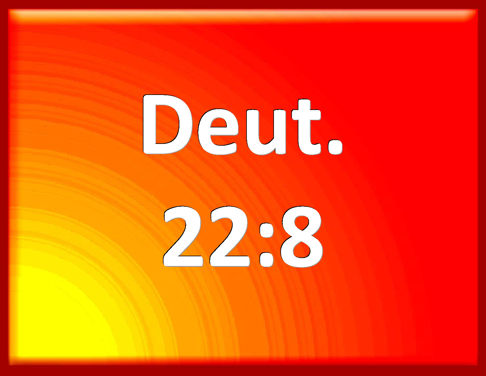 Bible Verse Slide Deuteronomy 22:8 When you build a new house, then you shall make a battlement for your roof, that you bring not blood on your house, if any man fall from there. KJV: When thou buildest a new house, then thou shalt make a battlement for thy roof, that thou bring not blood upon thine house, if any man fall from thence. DRB: When thou buildest a new house, thou shalt make a battlement to the roof round about: lest blood be shed in thy house, and thou be guilty, if any one slip, and fall down headlong. DBT: When thou buildest a new house, thou shalt make a parapet for thy roof, that thou bring not blood upon thy house, if any one should in any wise fall from it. ERV: When thou buildest a new house, then thou shalt make a battlement for thy roof, that thou bring not blood upon thine house, if any man fall from thence. WBT: When thou buildest a new house, then thou shalt make a battlement for thy roof, that thou mayest not bring blood upon thy house, if any man shall fall from thence. WEB: When you build a new house, then you shall make a battlement for your roof, that you don't bring blood on your house, if any man fall from there. YLT: 'When thou buildest a new house, then thou hast made a parapet to thy roof, and thou dost not put blood on thy house when one falleth from it.Links Deuteronomy 22:8 NIV • Deuteronomy 22:8 NLT • Deuteronomy 22:8 ESV • Deuteronomy 22:8 NASB • Deuteronomy 22:8 KJV • Deuteronomy 22:8 Interlinear • Deuteronomy 22:8 Commentaries • Deuteronomy 22:8 Parallel Texts • Deuteronomy 22:8 Bible Apps • Deuteronomy 22:8 Parallel • Bible Hub |
