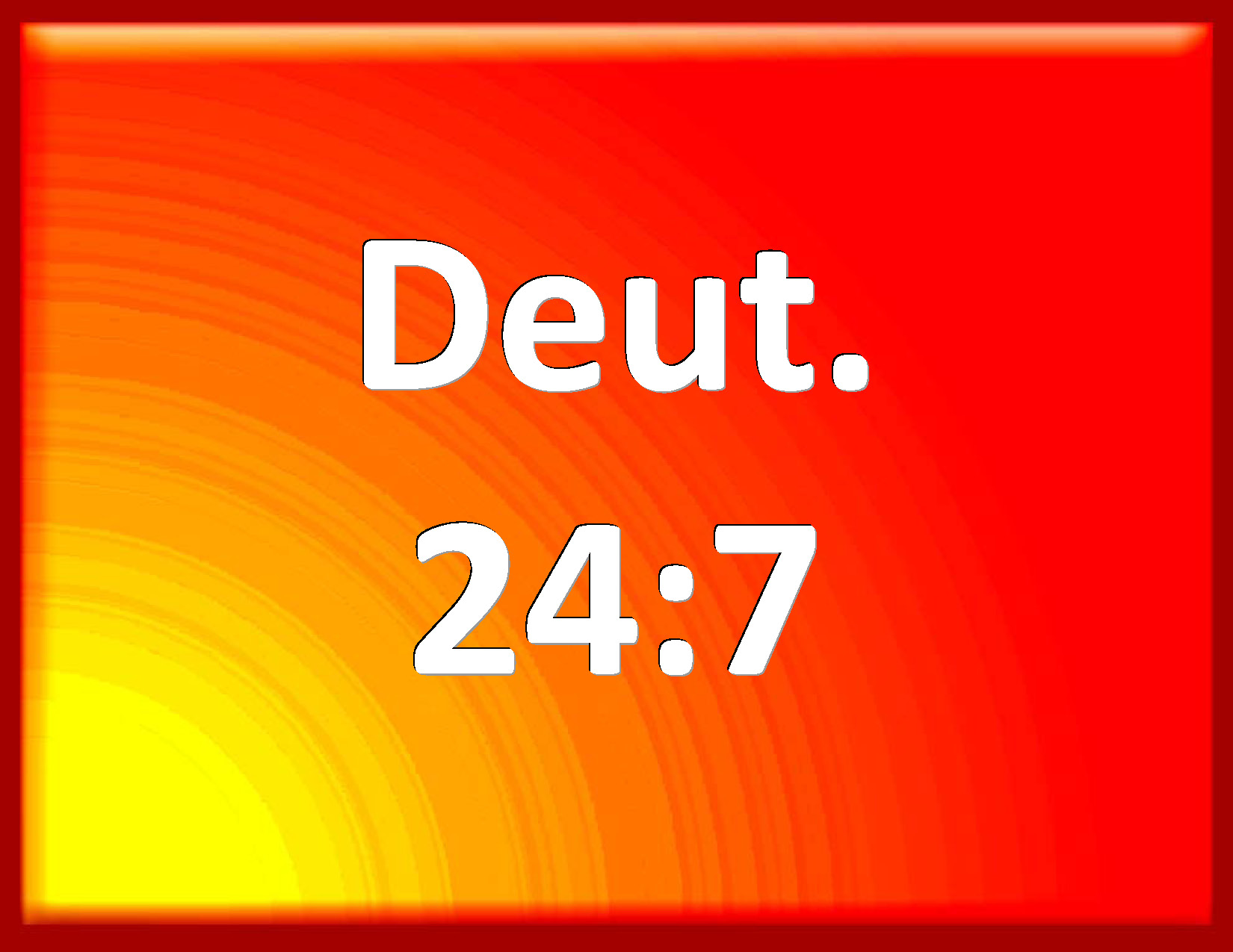 Bible Verse Slide Deuteronomy 24:7 If a man be found stealing any of his brothers of the children of Israel, and makes merchandise of him, or sells him; then that thief shall die; and you shall put evil away from among you. KJV: If a man be found stealing any of his brethren of the children of Israel, and maketh merchandise of him, or selleth him; then that thief shall die; and thou shalt put evil away from among you. DRB: If ally man be found soliciting his brother of the children of Israel, and selling him shall take a price, he shall be put to death, and thou shalt take away the evil from the midst of thee. DBT: If a man be found who hath stolen one of his brethren of the children of Israel, and who hath treated him as a slave and sold him, that thief shall die; and thou shalt put evil away from thy midst. ERV: If a man be found stealing any of his brethren of the children of Israel, and he deal with him as a slave, or sell him; then that thief shall die: so shalt thou put away the evil from the midst of thee. WBT: If a man shall be found stealing any of his brethren of the children of Israel, and shall make merchandise of him, or sell him; then that thief shall die; and thou shalt remove evil from among you. WEB: If a man be found stealing any of his brothers of the children of Israel, and he deal with him as a slave, or sell him; then that thief shall die: so you shall put away the evil from the midst of you. YLT: 'When a man is found stealing a person, of his brethren, of the sons of Israel, and hath tyrannized over him, and sold him, then hath that thief died, and thou hast put away the evil thing out of thy midst.Links Deuteronomy 24:7 NIV • Deuteronomy 24:7 NLT • Deuteronomy 24:7 ESV • Deuteronomy 24:7 NASB • Deuteronomy 24:7 KJV • Deuteronomy 24:7 Interlinear • Deuteronomy 24:7 Commentaries • Deuteronomy 24:7 Parallel Texts • Deuteronomy 24:7 Bible Apps • Deuteronomy 24:7 Parallel • Bible Hub |