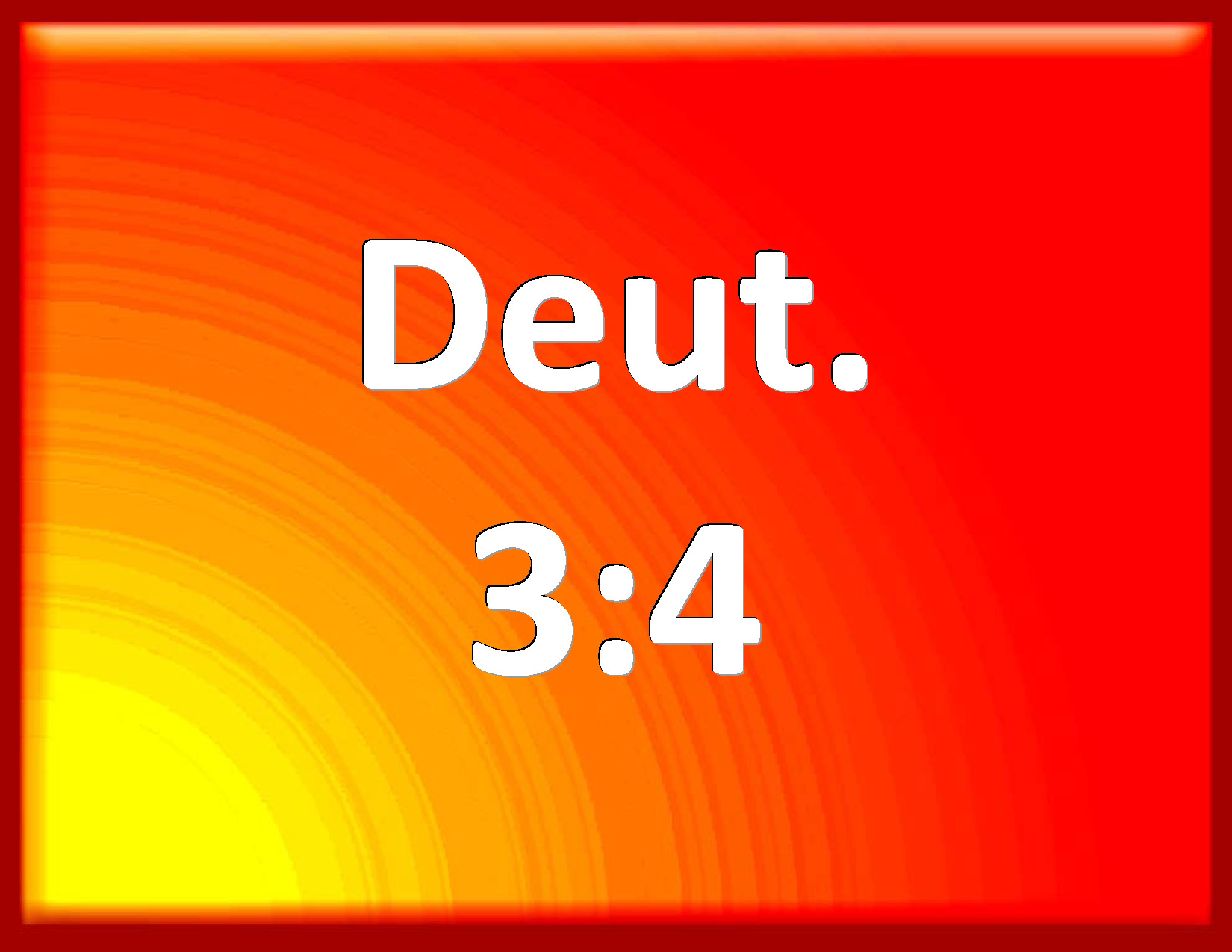 Bible Verse Slide Deuteronomy 3:4 And we took all his cities at that time, there was not a city which we took not from them, three score cities, all the region of Argob, the kingdom of Og in Bashan. KJV: And we took all his cities at that time, there was not a city which we took not from them, threescore cities, all the region of Argob, the kingdom of Og in Bashan. DRB: Wasting all his cities at one time, there was not a town that escaped us: sixty cities, all the country of Argob the kingdom of Og in Basan. DBT: And we took all his cities at that time: there was not a town which we took not from them, sixty cities, the whole region of Argob, the kingdom of Og in Bashan. ERV: And we took all his cities at that time; there was not a city which we took not from them; threescore cities, all the region of Argob, the kingdom of Og in Bashan. WBT: And we took all his cities at that time, there was not a city which we took not from them, sixty cities, all the region of Argob, the kingdom of Og in Bashan. WEB: We took all his cities at that time; there was not a city which we didn't take from them; sixty cities, all the region of Argob, the kingdom of Og in Bashan. YLT: and we capture all his cities at that time, there hath not been a city which we have not taken from them, sixty cities, all the region of Argob, the kingdom of Og in Bashan.Links Deuteronomy 3:4 NIV • Deuteronomy 3:4 NLT • Deuteronomy 3:4 ESV • Deuteronomy 3:4 NASB • Deuteronomy 3:4 KJV • Deuteronomy 3:4 Interlinear • Deuteronomy 3:4 Commentaries • Deuteronomy 3:4 Parallel Texts • Deuteronomy 3:4 Bible Apps • Deuteronomy 3:4 Parallel • Bible Hub |