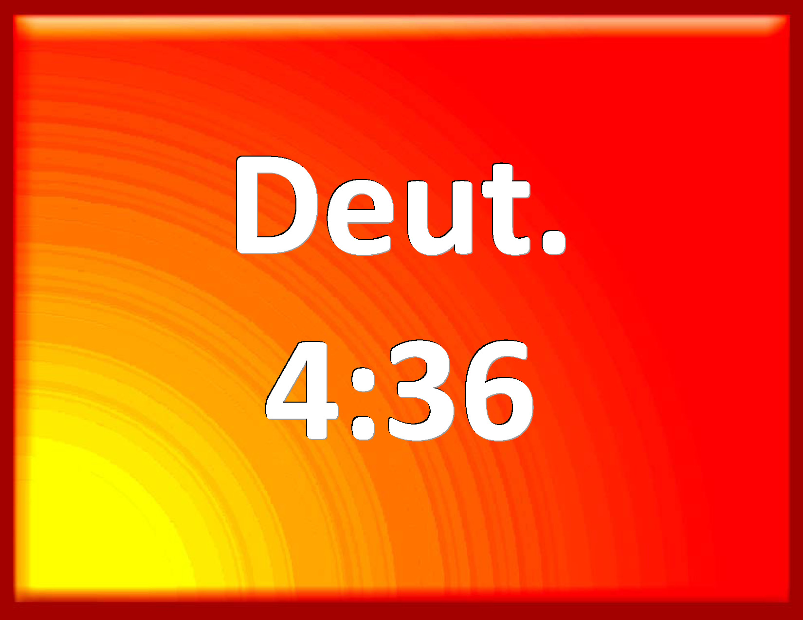 Bible Verse Slide Deuteronomy 4:36 Out of heaven he made you to hear his voice, that he might instruct you: and on earth he showed you his great fire; and you heard his words out of the middle of the fire. KJV: Out of heaven he made thee to hear his voice, that he might instruct thee: and upon earth he shewed thee his great fire; and thou heardest his words out of the midst of the fire. DRB: From heaven he made thee to hear his voice, that he might teach thee. And upon earth he shewed thee his exceeding great fire, and thou didst hear his words out of the midst of the fire, DBT: From the heavens he made thee hear his voice, that he might instruct thee; and on the earth he shewed thee his great fire; and thou heardest his words from the midst of the fire. ERV: Out of heaven he made thee to hear his voice, that he might instruct thee: and upon earth he made thee to see his great fire; and thou heardest his words out of the midst of the fire. WBT: Out of heaven he made thee to hear his voice, that he might instruct thee; and upon earth he showed thee his great fire; and thou heardst his words from the midst of the fire. WEB: Out of heaven he made you to hear his voice, that he might instruct you: and on earth he made you to see his great fire; and you heard his words out of the midst of the fire. YLT: 'From the heavens He hath caused thee to hear His voice, to instruct thee, and on earth He hath shewed thee His great fire, and His words thou hast heard out of the midst of the fire.Links Deuteronomy 4:36 NIV • Deuteronomy 4:36 NLT • Deuteronomy 4:36 ESV • Deuteronomy 4:36 NASB • Deuteronomy 4:36 KJV • Deuteronomy 4:36 Interlinear • Deuteronomy 4:36 Commentaries • Deuteronomy 4:36 Parallel Texts • Deuteronomy 4:36 Bible Apps • Deuteronomy 4:36 Parallel • Bible Hub |