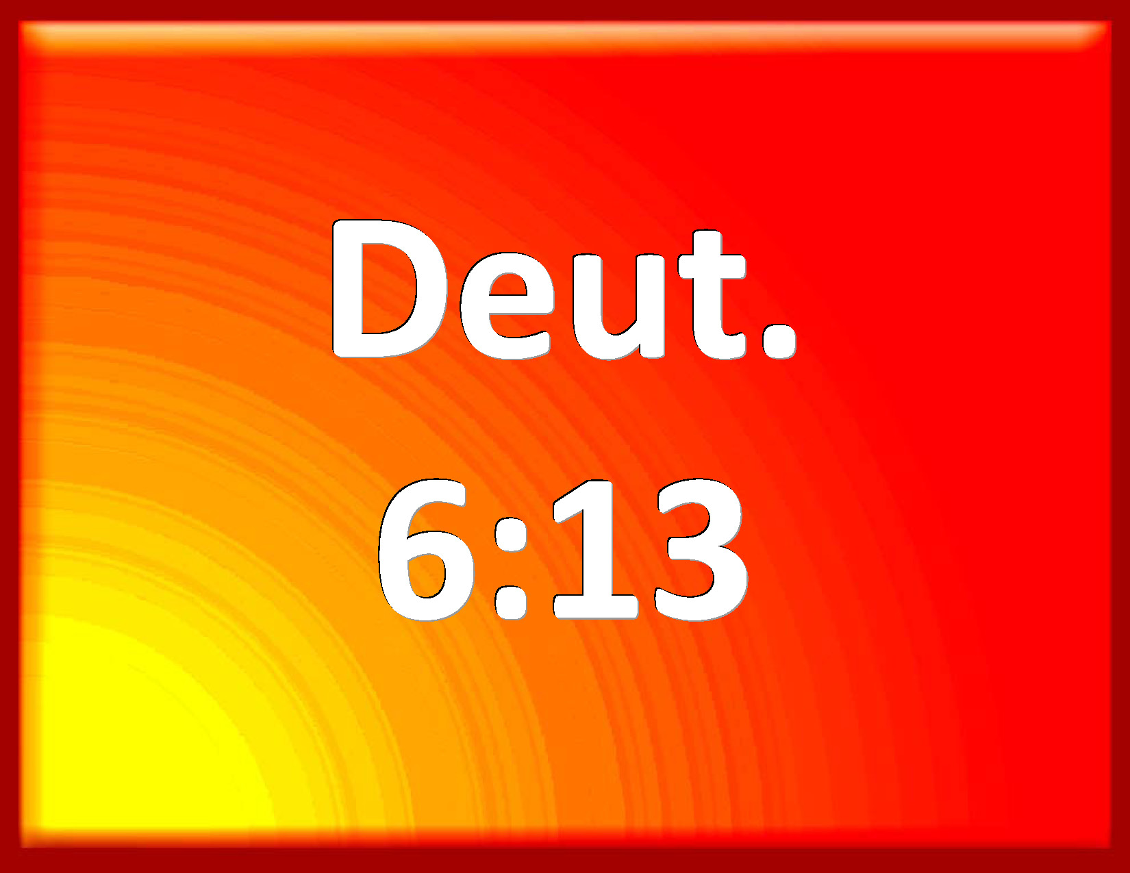 Bible Verse Slide Deuteronomy 6:13 You shall fear the LORD your God, and serve him, and shall swear by his name. KJV: Thou shalt fear the LORD thy God, and serve him, and shalt swear by his name. DRB: Take heed diligently lest thou forget the Lord, who brought thee out of the land of Egypt, out of the house of bondage. Thou shalt fear the Lord thy God, and shalt serve him only, and thou shalt swear by his name. DBT: Thou shalt fear Jehovah thy God, and serve him, and shalt swear by his name. ERV: Thou shalt fear the LORD thy God; and him shalt thou serve, and shalt swear by his name. WBT: Thou shalt fear the LORD thy God, and serve him, and shalt swear by his name. WEB: You shall fear Yahweh your God; and you shall serve him, and shall swear by his name. YLT: Jehovah thy God thou dost fear, and Him thou dost serve, and by His name thou dost swear;Links Deuteronomy 6:13 NIV • Deuteronomy 6:13 NLT • Deuteronomy 6:13 ESV • Deuteronomy 6:13 NASB • Deuteronomy 6:13 KJV • Deuteronomy 6:13 Interlinear • Deuteronomy 6:13 Commentaries • Deuteronomy 6:13 Parallel Texts • Deuteronomy 6:13 Bible Apps • Deuteronomy 6:13 Parallel • Bible Hub |