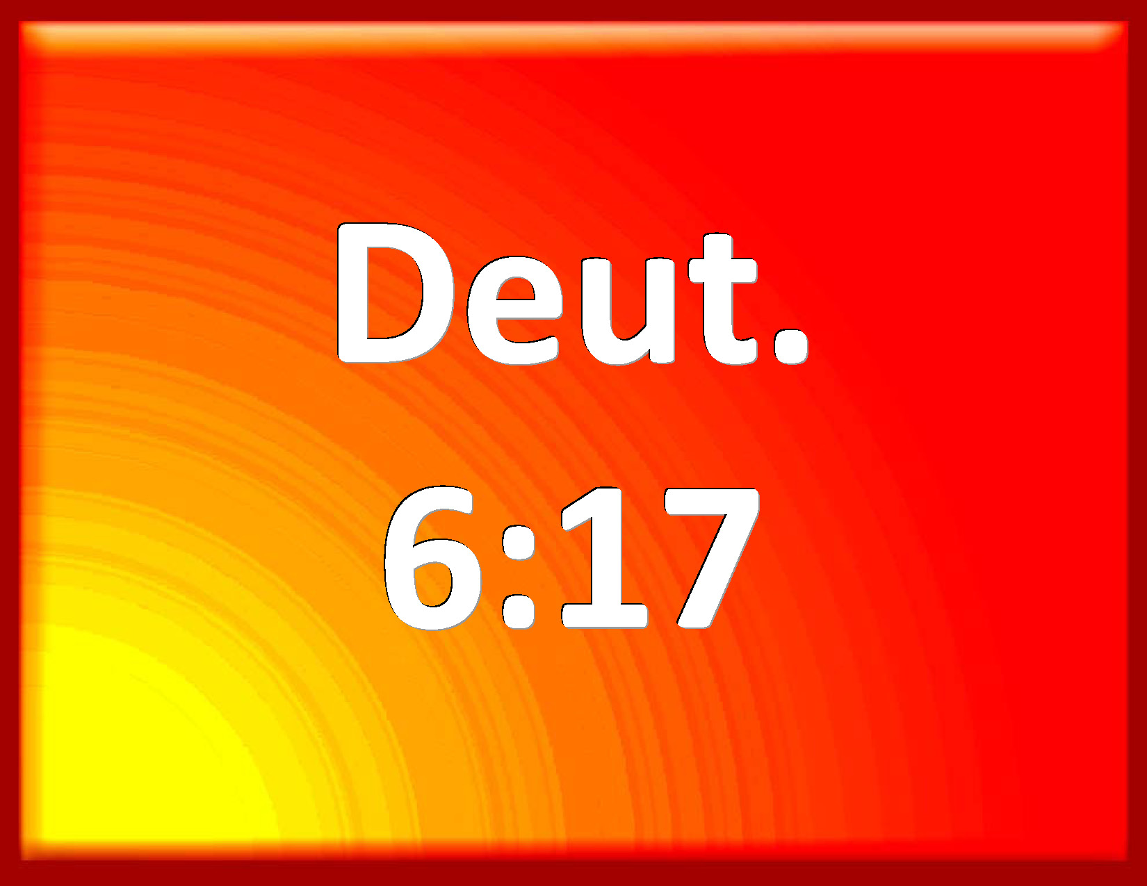 Bible Verse Slide Deuteronomy 6:17 You shall diligently keep the commandments of the LORD your God, and his testimonies, and his statutes, which he has commanded you. KJV: Ye shall diligently keep the commandments of the LORD your God, and his testimonies, and his statutes, which he hath commanded thee. DRB: Keep the precepts of the Lord thy God, and the testimonies and ceremonies which he hath commanded thee. DBT: Ye shall diligently keep the commandments of Jehovah your God, and his testimonies, and his statutes, which he hath commanded thee. ERV: Ye shall diligently keep the commandments of the LORD your God, and his testimonies, and his statutes, which he hath commanded thee. WBT: Ye shall diligently keep the commandments of the LORD your God, and his testimonies, and his statutes, which he hath commanded thee. WEB: You shall diligently keep the commandments of Yahweh your God, and his testimonies, and his statutes, which he has commanded you. YLT: ye do diligently keep the commands of Jehovah your God, and His testimonies, and His statutes which He hath commanded thee,Links Deuteronomy 6:17 NIV • Deuteronomy 6:17 NLT • Deuteronomy 6:17 ESV • Deuteronomy 6:17 NASB • Deuteronomy 6:17 KJV • Deuteronomy 6:17 Interlinear • Deuteronomy 6:17 Commentaries • Deuteronomy 6:17 Parallel Texts • Deuteronomy 6:17 Bible Apps • Deuteronomy 6:17 Parallel • Bible Hub |