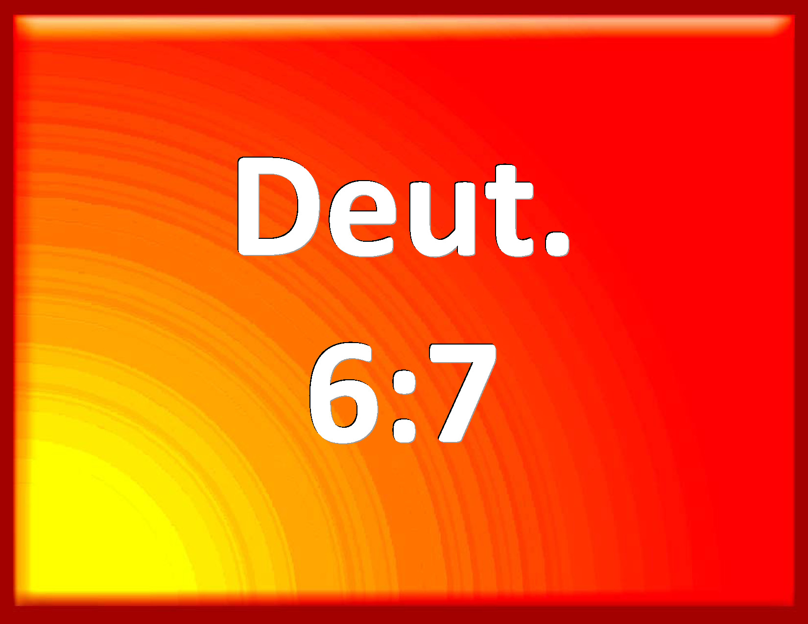 Bible Verse Slide Deuteronomy 6:7 And you shall teach them diligently to your children, and shall talk of them when you sit in your house, and when you walk by the way, and when you lie down, and when you rise up. KJV: And thou shalt teach them diligently unto thy children, and shalt talk of them when thou sittest in thine house, and when thou walkest by the way, and when thou liest down, and when thou risest up. DRB: And thou shalt tell them to thy children, and thou shalt meditate upon them sitting in thy house, and walking on thy journey, sleeping and rising. DBT: and thou shalt impress them on thy sons, and shalt talk of them when thou sittest in thy house, and when thou goest on the way, and when thou liest down, and when thou risest up. ERV: and thou shalt teach them diligently unto thy children, and shalt talk of them when thou sittest in thine house, and when thou walkest by the way, and when thou liest down, and when thou risest up. WBT: And thou shalt teach them diligently to thy children, and shalt talk of them when thou sittest in thy house, and when thou walkest by the way, and when thou liest down, and when thou risest up. WEB: and you shall teach them diligently to your children, and shall talk of them when you sit in your house, and when you walk by the way, and when you lie down, and when you rise up. YLT: and thou hast repeated them to thy sons, and spoken of them in thy sitting in thine house, and in thy walking in the way, and in thy lying down, and in thy rising up,Links Deuteronomy 6:7 NIV • Deuteronomy 6:7 NLT • Deuteronomy 6:7 ESV • Deuteronomy 6:7 NASB • Deuteronomy 6:7 KJV • Deuteronomy 6:7 Interlinear • Deuteronomy 6:7 Commentaries • Deuteronomy 6:7 Parallel Texts • Deuteronomy 6:7 Bible Apps • Deuteronomy 6:7 Parallel • Bible Hub |