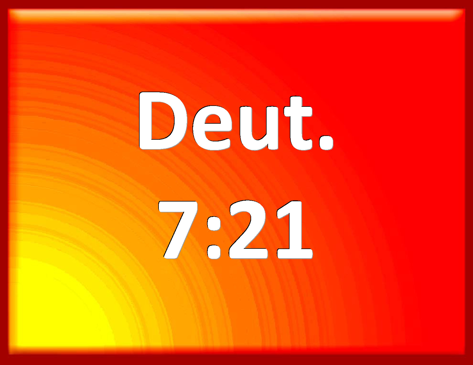 Bible Verse Slide Deuteronomy 7:21 You shall not be affrighted at them: for the LORD your God is among you, a mighty God and terrible. KJV: Thou shalt not be affrighted at them: for the LORD thy God is among you, a mighty God and terrible. DRB: Thou shalt not fear them, because the Lord thy God is in the midst of thee, a God mighty and terrible: DBT: Thou shalt not be afraid of them; for Jehovah thy God is in thy midst, a God great and terrible. ERV: Thou shalt not be affrighted at them: for the LORD thy God is in the midst of thee, a great God and a terrible. WBT: Thou shalt not be affrighted at them: for the LORD thy God is among you, a mighty God and terrible. WEB: You shall not be scared of them; for Yahweh your God is in the midst of you, a great and awesome God. YLT: thou art not terrified by their presence, for Jehovah thy God is in thy midst, a God great and fearful.Links Deuteronomy 7:21 NIV • Deuteronomy 7:21 NLT • Deuteronomy 7:21 ESV • Deuteronomy 7:21 NASB • Deuteronomy 7:21 KJV • Deuteronomy 7:21 Interlinear • Deuteronomy 7:21 Commentaries • Deuteronomy 7:21 Parallel Texts • Deuteronomy 7:21 Bible Apps • Deuteronomy 7:21 Parallel • Bible Hub |