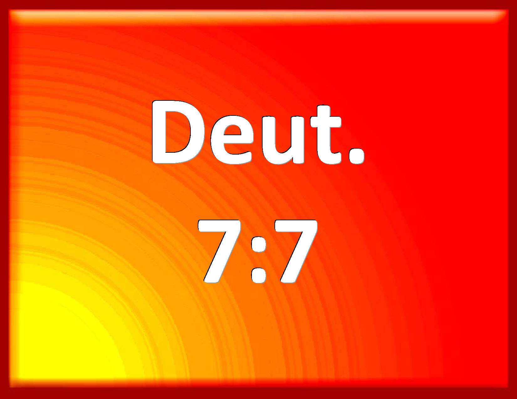 Bible Verse Slide Deuteronomy 7:7 The LORD did not set his love on you, nor choose you, because you were more in number than any people; for you were the fewest of all people: KJV: The LORD did not set his love upon you, nor choose you, because ye were more in number than any people; for ye were the fewest of all people: DRB: Not because you surpass all nations in number, is the Lord joined unto you, and hath chosen you, for you are the fewest of any people: DBT: Not because ye were more in number than all the peoples, hath Jehovah been attached to you and chosen you, for ye are the fewest of all the peoples; ERV: The LORD did not set his love upon you, nor choose you, because ye were more in number than any people; for ye were the fewest of all peoples: WBT: The LORD did not set his love upon you, nor choose you, because ye were more in number than any people; for ye were the fewest of all people: WEB: Yahweh didn't set his love on you, nor choose you, because you were more in number than any people; for you were the fewest of all peoples: YLT: Not because of your being more numerous than any of the peoples hath Jehovah delighted in you, and fixeth on you, for ye are the least of all the peoples,Links Deuteronomy 7:7 NIV • Deuteronomy 7:7 NLT • Deuteronomy 7:7 ESV • Deuteronomy 7:7 NASB • Deuteronomy 7:7 KJV • Deuteronomy 7:7 Interlinear • Deuteronomy 7:7 Commentaries • Deuteronomy 7:7 Parallel Texts • Deuteronomy 7:7 Bible Apps • Deuteronomy 7:7 Parallel • Bible Hub |