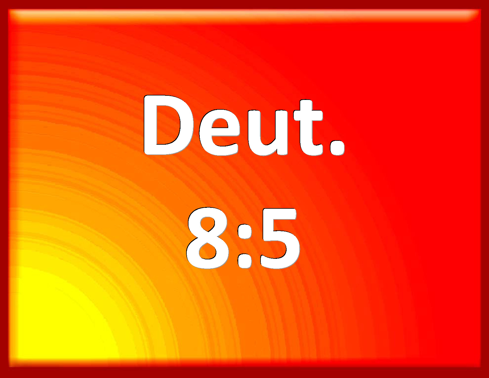 Bible Verse Slide Deuteronomy 8:5 You shall also consider in your heart, that, as a man chastens his son, so the LORD your God chastens you. KJV: Thou shalt also consider in thine heart, that, as a man chasteneth his son, so the LORD thy God chasteneth thee. DRB: That thou mayst consider in thy heart, that as a man traineth up his son, so the Lord thy God hath trained thee up. DBT: And know in thy heart that, as a man chasteneth his son, so Jehovah thy God chasteneth thee; ERV: And thou shalt consider in thine heart, that, as a man chasteneth his son, so the LORD thy God chasteneth thee. WBT: Thou shalt also consider in thy heart, that as a man chasteneth his son, so the LORD thy God chasteneth thee. WEB: You shall consider in your heart that as a man chastens his son, so Yahweh your God chastens you. YLT: and thou hast known, with thy heart, that as a man chastiseth his son Jehovah thy God is chastising thee,Links Deuteronomy 8:5 NIV • Deuteronomy 8:5 NLT • Deuteronomy 8:5 ESV • Deuteronomy 8:5 NASB • Deuteronomy 8:5 KJV • Deuteronomy 8:5 Interlinear • Deuteronomy 8:5 Commentaries • Deuteronomy 8:5 Parallel Texts • Deuteronomy 8:5 Bible Apps • Deuteronomy 8:5 Parallel • Bible Hub |