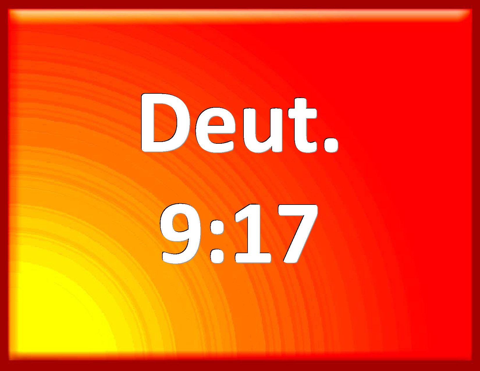 Bible Verse Slide Deuteronomy 9:17 And I took the two tables, and cast them out of my two hands, and broke them before your eyes. KJV: And I took the two tables, and cast them out of my two hands, and brake them before your eyes. DRB: I cast the tables out of my hands, and broke them in your sight. DBT: And I seized the two tables, and cast them out of my two hands, and broke them before your eyes. ERV: And I took hold of the two tables, and cast them out of my two hands, and brake them before your eyes. WBT: And I took the two tables, and cast them out of my two hands, and broke them before your eyes. WEB: I took hold of the two tables, and cast them out of my two hands, and broke them before your eyes. YLT: 'And I lay hold on the two tables, and cast them out of my two hands, and break them before your eyes,Links Deuteronomy 9:17 NIV • Deuteronomy 9:17 NLT • Deuteronomy 9:17 ESV • Deuteronomy 9:17 NASB • Deuteronomy 9:17 KJV • Deuteronomy 9:17 Interlinear • Deuteronomy 9:17 Commentaries • Deuteronomy 9:17 Parallel Texts • Deuteronomy 9:17 Bible Apps • Deuteronomy 9:17 Parallel • Bible Hub |