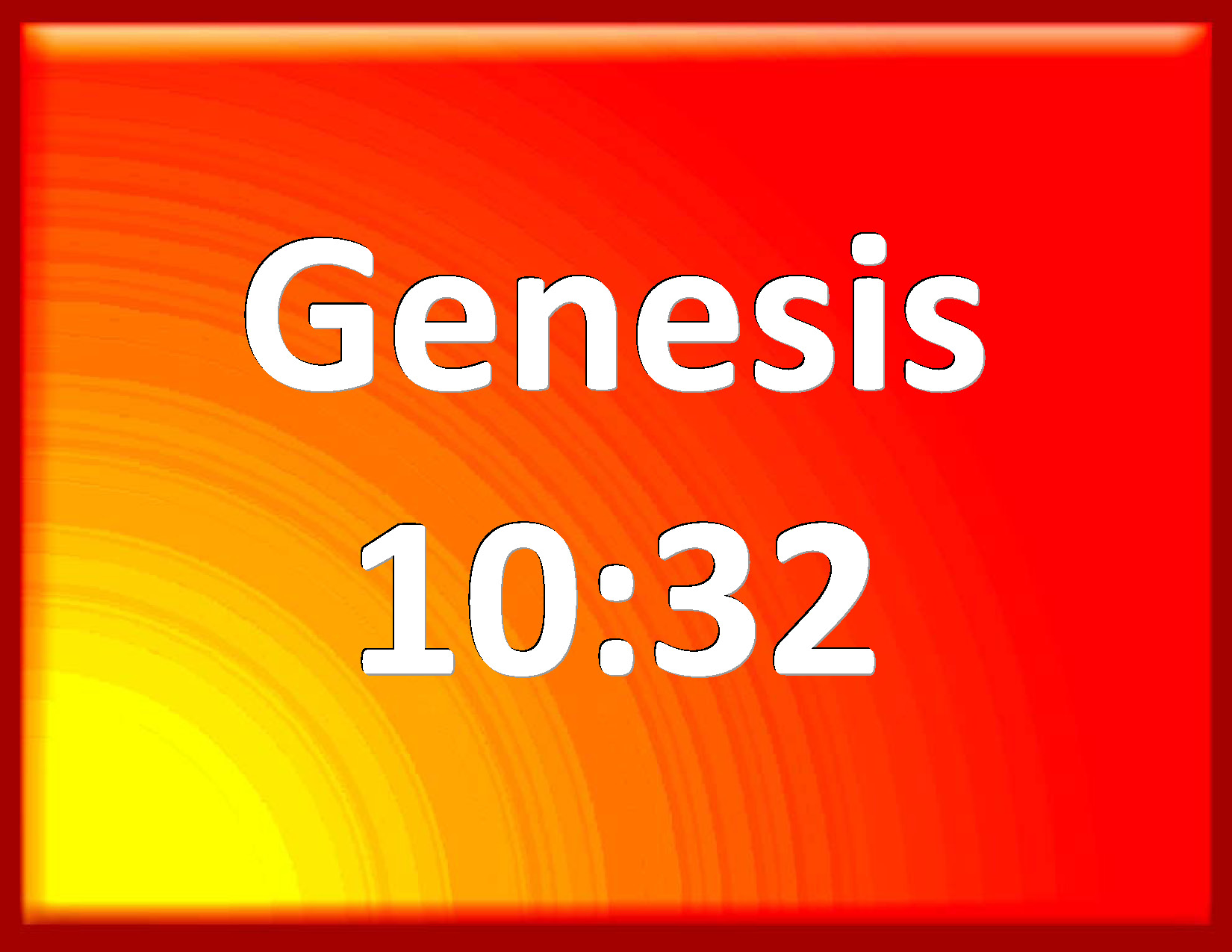 Bible Verse Slide Genesis 10:32 These are the families of the sons of Noah, after their generations, in their nations: and by these were the nations divided in the earth after the flood. KJV: These are the families of the sons of Noah, after their generations, in their nations: and by these were the nations divided in the earth after the flood. DRB: These are the families of Noe, according to their peoples and nations. By these were the nations divided on the earth after the flood. DBT: These are the families of the sons of Noah, after their generations, in their nations. And from these came the distribution of the nations on the earth after the flood. ERV: These are the families of the sons of Noah, after their generations, in their nations: and of these were the nations divided in the earth after the flood. WBT: These are the families of the sons of Noah after their generations, in their nations: and by these were the nations divided in the earth after the flood. WEB: These are the families of the sons of Noah, after their generations, in their nations. Of these were the nations divided in the earth after the flood. YLT: These are families of the sons of Noah, by their births, in their nations, and by these have the nations been parted in the earth after the deluge.Links Genesis 10:32 NIV • Genesis 10:32 NLT • Genesis 10:32 ESV • Genesis 10:32 NASB • Genesis 10:32 KJV • Genesis 10:32 Interlinear • Genesis 10:32 Commentaries • Genesis 10:32 Parallel Texts • Genesis 10:32 Bible Apps • Genesis 10:32 Parallel • Bible Hub |
