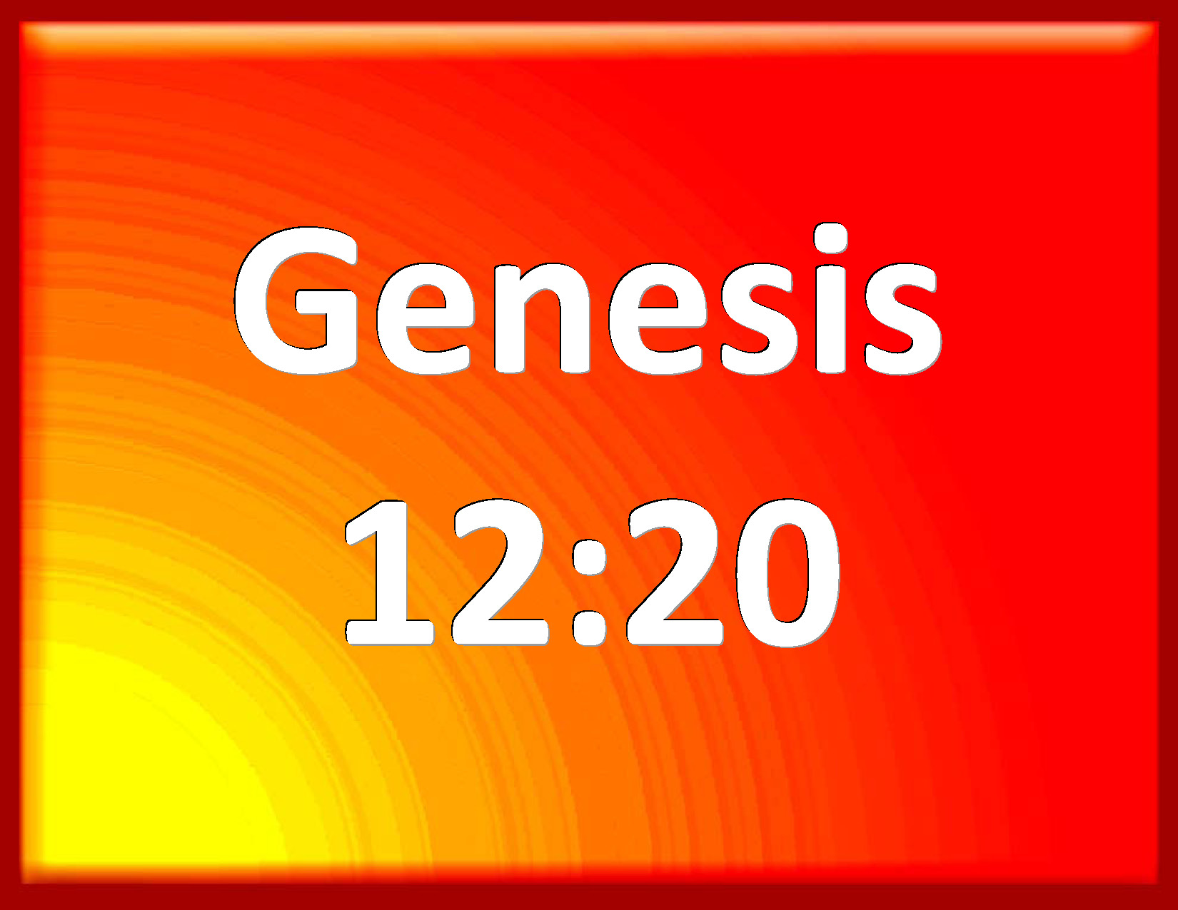 Bible Verse Slide Genesis 12:20 And Pharaoh commanded his men concerning him: and they sent him away, and his wife, and all that he had. KJV: And Pharaoh commanded his men concerning him: and they sent him away, and his wife, and all that he had. DRB: And Pharao gave his men orders concerning Abram: and they led him away, and his wife, and all that he had. DBT: And Pharaoh commanded his men concerning him, and they sent him away, and his wife, and all that he had. ERV: And Pharaoh gave men charge concerning him: and they brought him on the way, and his wife, and all that he had. WBT: And Pharaoh commanded his men concerning him: and they sent him away, and his wife, and all that he had. WEB: Pharaoh commanded men concerning him, and they brought him on the way with his wife and all that he had. YLT: And Pharaoh chargeth men concerning him, and they send him away, and his wife, an all that he hath.Links Genesis 12:20 NIV • Genesis 12:20 NLT • Genesis 12:20 ESV • Genesis 12:20 NASB • Genesis 12:20 KJV • Genesis 12:20 Interlinear • Genesis 12:20 Commentaries • Genesis 12:20 Parallel Texts • Genesis 12:20 Bible Apps • Genesis 12:20 Parallel • Bible Hub |
