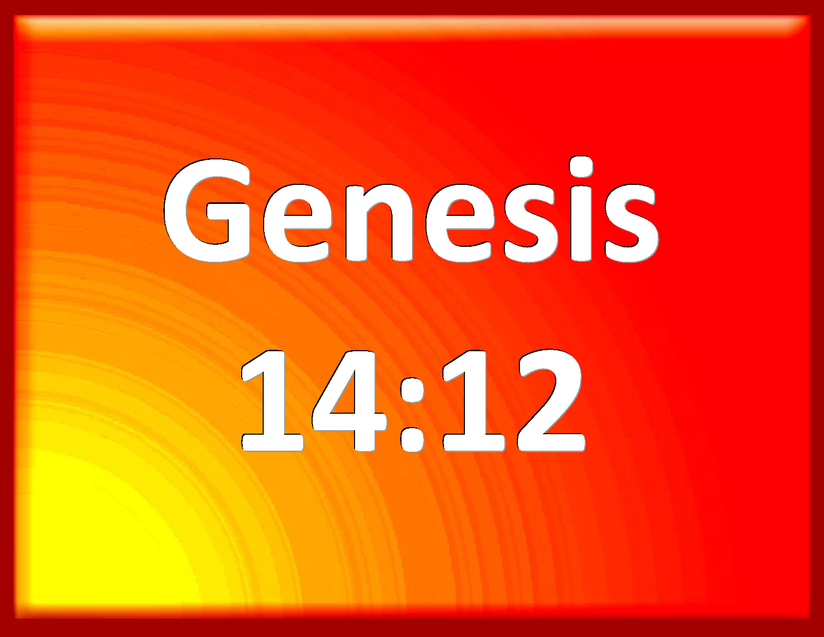 Bible Verse Slide Genesis 14:12 And they took Lot, Abram's brother's son, who dwelled in Sodom, and his goods, and departed. KJV: And they took Lot, Abram's brother's son, who dwelt in Sodom, and his goods, and departed. DRB: And Lot also, the son of Abram's brother, who dwelt in Sodom, and his substance. DBT: And they took Lot and his property, Abram's brother's son, and departed. For he dwelt in Sodom. ERV: And they took Lot, Abram's brother's son, who dwelt in Sodom, and his goods, and departed. WBT: And they took Lot, Abram's brother's son, who dwelt in Sodom, and his goods, and departed. WEB: They took Lot, Abram's brother's son, who lived in Sodom, and his goods, and departed. YLT: and they take Lot, Abram's brother's son (seeing he is dwelling in Sodom), and his substance, and go away.Links Genesis 14:12 NIV • Genesis 14:12 NLT • Genesis 14:12 ESV • Genesis 14:12 NASB • Genesis 14:12 KJV • Genesis 14:12 Interlinear • Genesis 14:12 Commentaries • Genesis 14:12 Parallel Texts • Genesis 14:12 Bible Apps • Genesis 14:12 Parallel • Bible Hub |