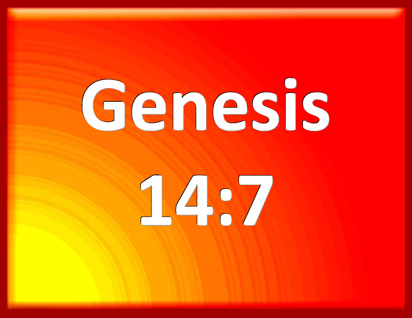 Bible Verse Slide Genesis 14:7 And they returned, and came to Enmishpat, which is Kadesh, and smote all the country of the Amalekites, and also the Amorites, that dwelled in Hazezontamar. KJV: And they returned, and came to Enmishpat, which is Kadesh, and smote all the country of the Amalekites, and also the Amorites, that dwelt in Hazezontamar. DRB: And they returned, and came to the fountain of Misphat, the same is Cades: and they smote all the country of the Amalecites, and the Amorrhean that dwelt in Asasonthamar. DBT: And they returned, and came to En-mishpat, which is Kadesh, and smote all the country of the Amalekites, and also the Amorites that dwelt at Hazazon-Tamar. ERV: And they returned, and came to En-mishpat (the same is Kadesh), and smote all the country of the Amalekites, and also the Amorites, that dwelt in Hazazon-tamar. WBT: And they returned, and came to En-mishpat, which is Kadesh, and smote all the country of the Amalekites, and also the Amorites, that dwelt in Hazezontamar. WEB: They returned, and came to En Mishpat (the same is Kadesh), and struck all the country of the Amalekites, and also the Amorites, that lived in Hazazon Tamar. YLT: and they turn back and come in unto En-Mishpat, which is Kadesh, and smite the whole field of the Amalekite, and also the Amorite who is dwelling in Hazezon-Tamar.Links Genesis 14:7 NIV • Genesis 14:7 NLT • Genesis 14:7 ESV • Genesis 14:7 NASB • Genesis 14:7 KJV • Genesis 14:7 Interlinear • Genesis 14:7 Commentaries • Genesis 14:7 Parallel Texts • Genesis 14:7 Bible Apps • Genesis 14:7 Parallel • Bible Hub |