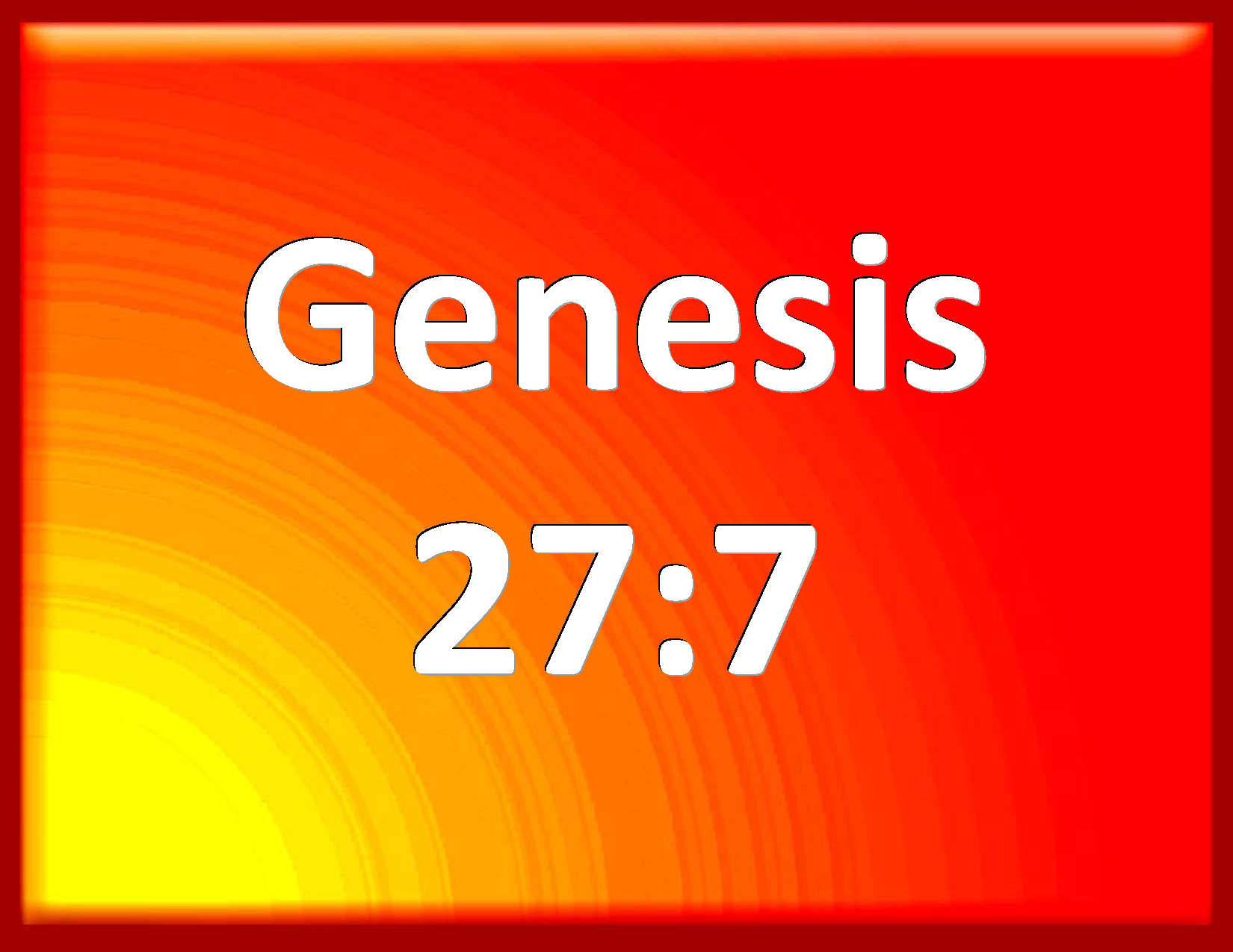 Bible Verse Slide Genesis 27:7 Bring me venison, and make me savoury meat, that I may eat, and bless you before the LORD before my death. KJV: Bring me venison, and make me savoury meat, that I may eat, and bless thee before the LORD before my death. DRB: Bring me of thy hunting, and make me meats that I may eat, and bless thee in the sight of the Lord, before I die. DBT: Bring me venison, and prepare me a savoury dish, that I may eat, and bless thee before Jehovah, before my death. ERV: Bring me venison, and make me savoury meat, that I may eat, and bless thee before the LORD before my death. WBT: Bring me venison, and make me savory meat, that I may eat, and bless thee before the LORD, before my death. WEB: 'Bring me venison, and make me savory food, that I may eat, and bless you before Yahweh before my death.' YLT: Bring for me provision, and make for me tasteful things, and I do eat, and bless thee before Jehovah before my death.Links Genesis 27:7 NIV • Genesis 27:7 NLT • Genesis 27:7 ESV • Genesis 27:7 NASB • Genesis 27:7 KJV • Genesis 27:7 Interlinear • Genesis 27:7 Commentaries • Genesis 27:7 Parallel Texts • Genesis 27:7 Bible Apps • Genesis 27:7 Parallel • Bible Hub |