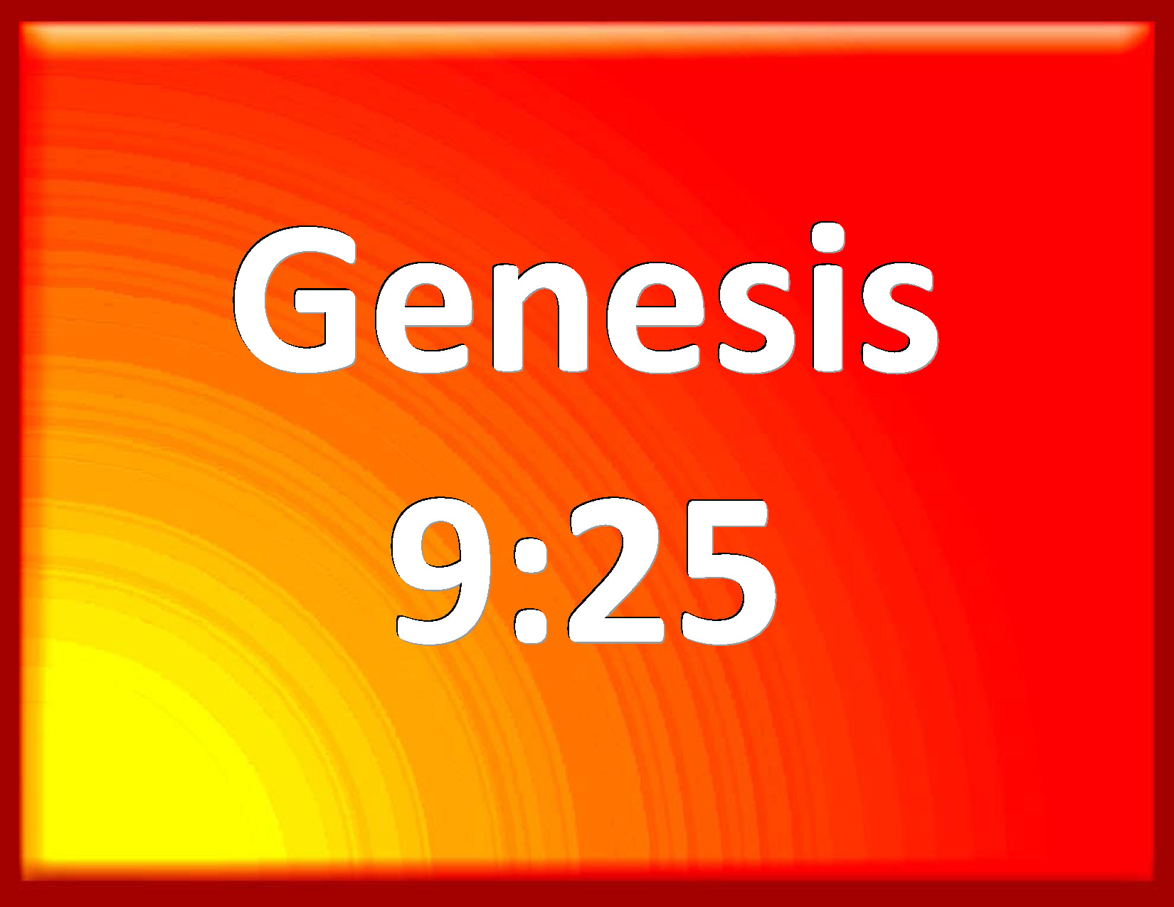 Bible Verse Slide Genesis 9:25 And he said, Cursed be Canaan; a servant of servants shall he be to his brothers. KJV: And he said, Cursed be Canaan; a servant of servants shall he be unto his brethren. DRB: He said: Cursed be Chaanan, a servant of servants, shall he be unto his brethren. DBT: And he said, Cursed be Canaan; Let him be a bondman of bondmen to his brethren. ERV: And he said, Cursed be Canaan; A servant of servants shall he be unto his brethren. WBT: And he said, Cursed be Canaan, a servant of servants shall he be to his brethren. WEB: He said, "Canaan is cursed. He will be servant of servants to his brothers." YLT: and saith: 'Cursed is Canaan, Servant of servants he is to his brethren.'Links Genesis 9:25 NIV • Genesis 9:25 NLT • Genesis 9:25 ESV • Genesis 9:25 NASB • Genesis 9:25 KJV • Genesis 9:25 Interlinear • Genesis 9:25 Commentaries • Genesis 9:25 Parallel Texts • Genesis 9:25 Bible Apps • Genesis 9:25 Parallel • Bible Hub |