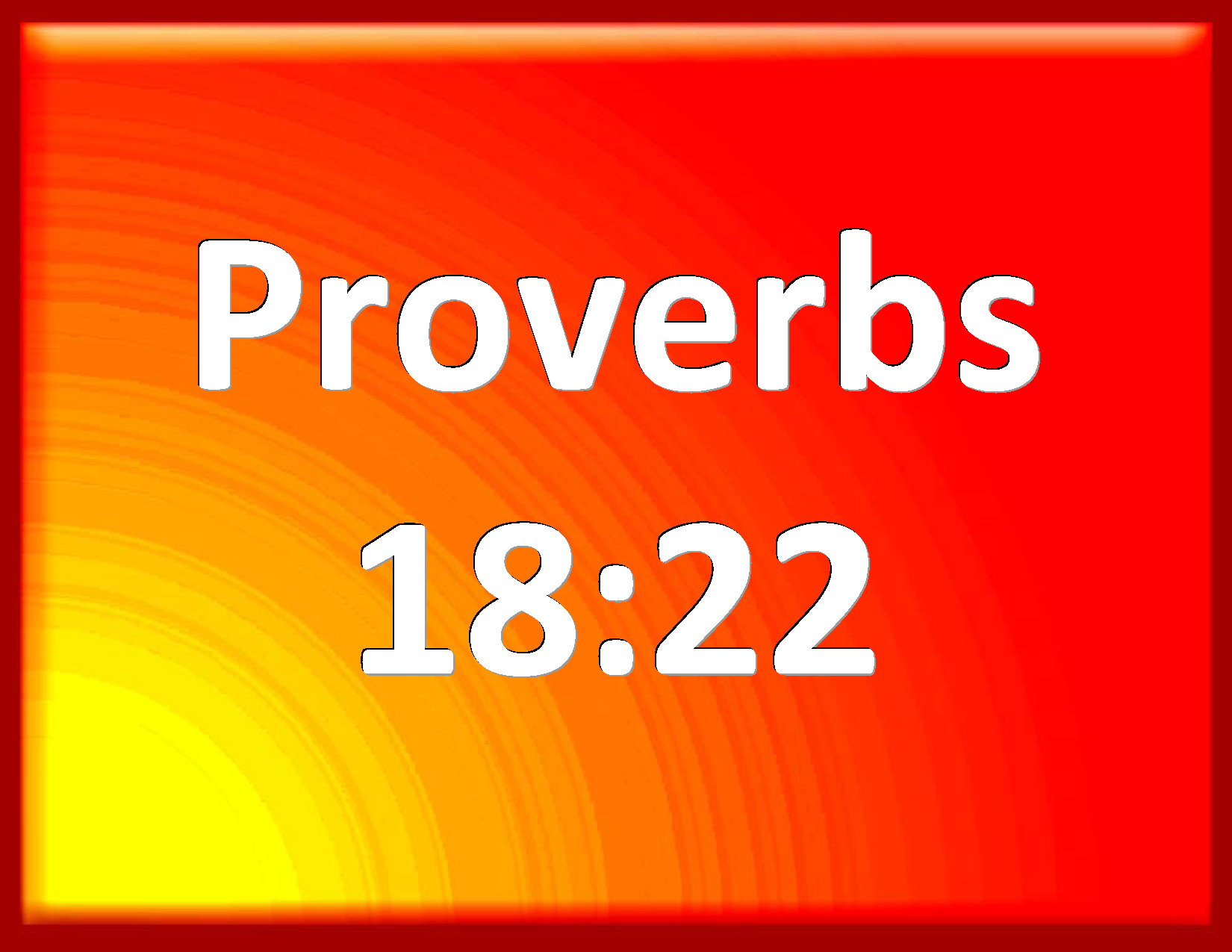 Bible Verse Slide Proverbs 18:22 Whoever finds a wife finds a good thing, and obtains favor of the LORD. KJV: Whoso findeth a wife findeth a good thing, and obtaineth favour of the LORD. DRB: He that hath found a good wife, hath found a good thing, and shall receive a pleasure from the Lord. He that driveth away a good wife, driveth away a good thing: but he that keepeth an adulteress, is foolish and wicked. DBT: Whoso hath found a wife hath found a good thing, and hath obtained favour from Jehovah. ERV: Whoso findeth a wife findeth a good thing, and obtaineth favour of the LORD. WBT: Whoever findeth a wife findeth a good thing, and obtaineth favor from the LORD. WEB: Whoever finds a wife finds a good thing, and obtains favor of Yahweh. YLT: Whoso hath found a wife hath found good, And bringeth out good-will from Jehovah.Links Proverbs 18:22 NIV • Proverbs 18:22 NLT • Proverbs 18:22 ESV • Proverbs 18:22 NASB • Proverbs 18:22 KJV • Proverbs 18:22 Interlinear • Proverbs 18:22 Commentaries • Proverbs 18:22 Parallel Texts • Proverbs 18:22 Bible Apps • Proverbs 18:22 Parallel • Bible Hub |