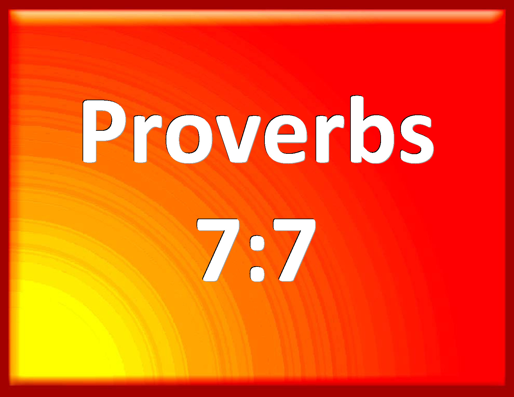 Bible Verse Slide Proverbs 7:7 And beheld among the simple ones, I discerned among the youths, a young man void of understanding, KJV: And beheld among the simple ones, I discerned among the youths, a young man void of understanding, DRB: And I see little ones, I behold a foolish young man, DBT: and I beheld among the simple ones, I discerned among the sons, a young man void of understanding, ERV: And I beheld among the simple ones, I discerned among the youths, a young man void of understanding, WBT: And beheld among the simple ones, I discerned among the youths, a young man void of understanding, WEB: I saw among the simple ones. I discerned among the youths a young man void of understanding, YLT: And I do see among the simple ones, I discern among the sons, A young man lacking understanding,Links Proverbs 7:7 NIV • Proverbs 7:7 NLT • Proverbs 7:7 ESV • Proverbs 7:7 NASB • Proverbs 7:7 KJV • Proverbs 7:7 Interlinear • Proverbs 7:7 Commentaries • Proverbs 7:7 Parallel Texts • Proverbs 7:7 Bible Apps • Proverbs 7:7 Parallel • Bible Hub |