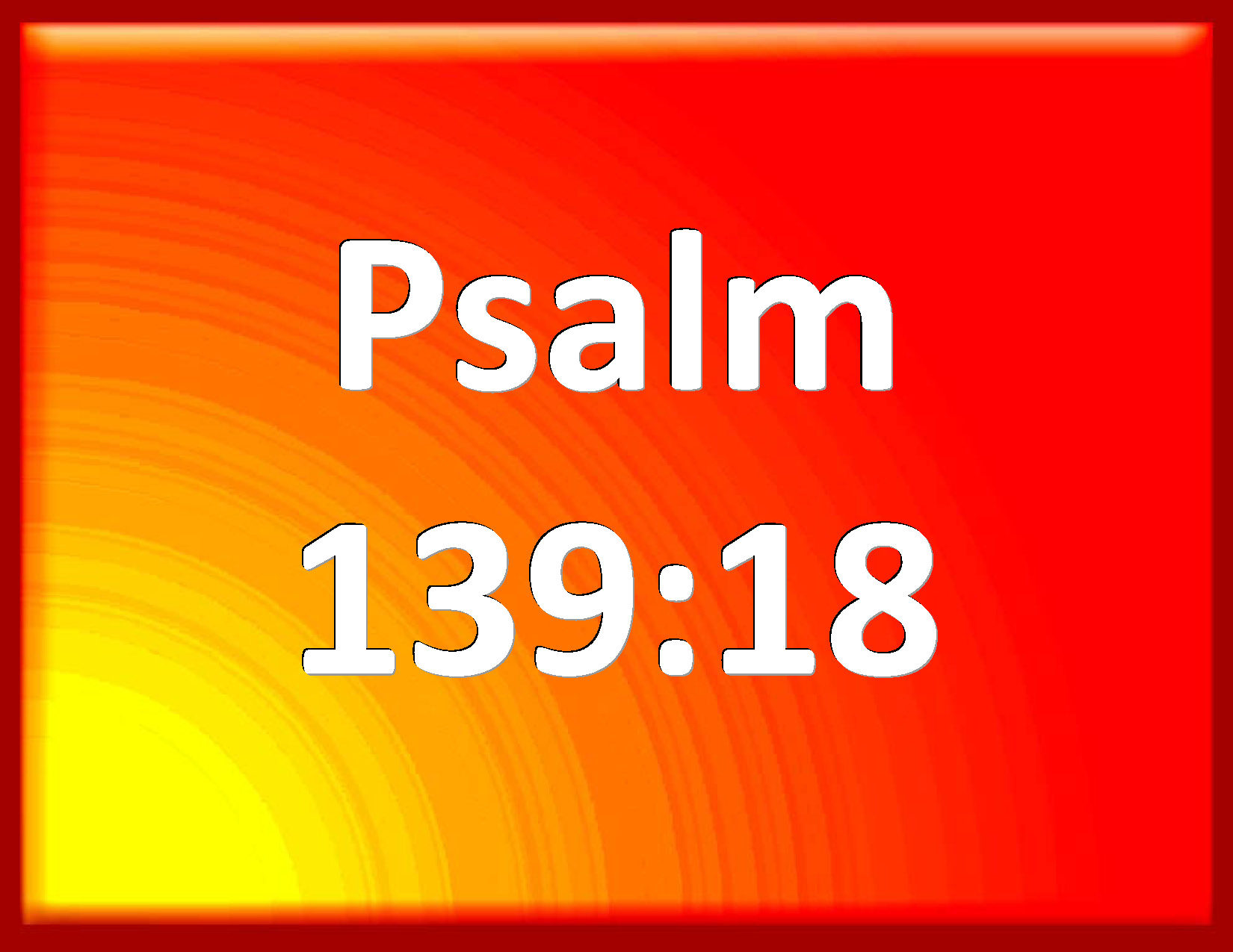 Bible Verse Slide Psalm 139:18 If I should count them, they are more in number than the sand: when I awake, I am still with you. KJV: If I should count them, they are more in number than the sand: when I awake, I am still with thee. DRB: I will number them, and they shall be multiplied above the sand: I rose up and am still with thee. DBT: If I would count them, they are more in number than the sand. When I awake, I am still with thee. ERV: If I should count them, they are more in number than the sand: when I awake, I am still with thee. WBT: If I should count them, they are more in number than the sand: when I awake, I am still with thee. WEB: If I would count them, they are more in number than the sand. When I wake up, I am still with you. YLT: I recount them! than the sand they are more, I have waked, and I am still with Thee.Links Psalm 139:18 NIV • Psalm 139:18 NLT • Psalm 139:18 ESV • Psalm 139:18 NASB • Psalm 139:18 KJV • Psalm 139:18 Interlinear • Psalm 139:18 Commentaries • Psalm 139:18 Parallel Texts • Psalm 139:18 Bible Apps • Psalm 139:18 Parallel • Bible Hub |