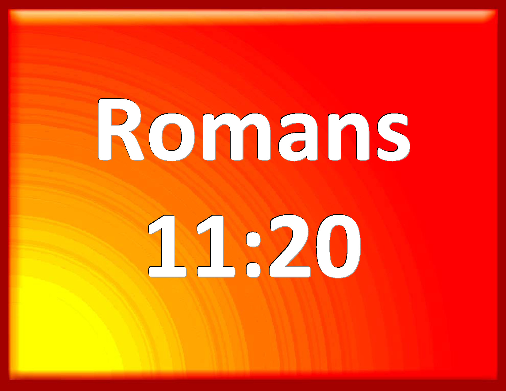 Bible Verse Slide Romans 11:20 Well; because of unbelief they were broken off, and you stand by faith. Be not high minded, but fear: KJV: Well; because of unbelief they were broken off, and thou standest by faith. Be not highminded, but fear: DRB: Well: because of unbelief they were broken off. But thou standest by faith: be not highminded, but fear. DBT: Right: they have been broken out through unbelief, and thou standest through faith. Be not high-minded, but fear: ERV: Well; by their unbelief they were broken off, and thou standest by thy faith. Be not highminded, but fear: WBT: Well; because of unbelief they were broken off, and thou standest by faith. Be not high-minded, but fear: WEB: True; by their unbelief they were broken off, and you stand by your faith. Don't be conceited, but fear; YLT: by unbelief they were broken off, and thou hast stood by faith; be not high-minded, but be fearing;Links Romans 11:20 NIV • Romans 11:20 NLT • Romans 11:20 ESV • Romans 11:20 NASB • Romans 11:20 KJV • Romans 11:20 Interlinear • Romans 11:20 Commentaries • Romans 11:20 Parallel Texts • Romans 11:20 Bible Apps • Romans 11:20 Parallel • Bible Hub |
