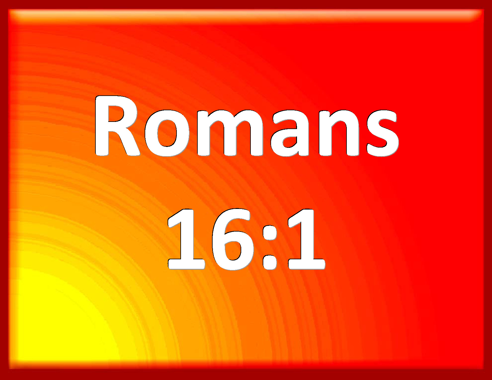 Bible Verse Slide Romans 16:1 I commend to you Phebe our sister, which is a servant of the church which is at Cenchrea: KJV: I commend unto you Phebe our sister, which is a servant of the church which is at Cenchrea: DRB: AND I commend to you Phebe, our sister, who is in the ministry of the church, that is in Cenchrae: DBT: But I commend to you Phoebe, our sister, who is minister of the assembly which is in Cenchrea; ERV: I commend unto you Phoebe our sister, who is a servant of the church that is at Cenchreae: WBT: I commend to you Phebe our sister, who is a servant of the church which is at Cenchrea: WEB: I commend to you Phoebe, our sister, who is a servant of the assembly that is at Cenchreae, YLT: And I commend you to Phebe our sister — being a ministrant of the assembly that is in Cenchrea — Links Romans 16:1 NIV • Romans 16:1 NLT • Romans 16:1 ESV • Romans 16:1 NASB • Romans 16:1 KJV • Romans 16:1 Interlinear • Romans 16:1 Commentaries • Romans 16:1 Parallel Texts • Romans 16:1 Bible Apps • Romans 16:1 Parallel • Bible Hub |
