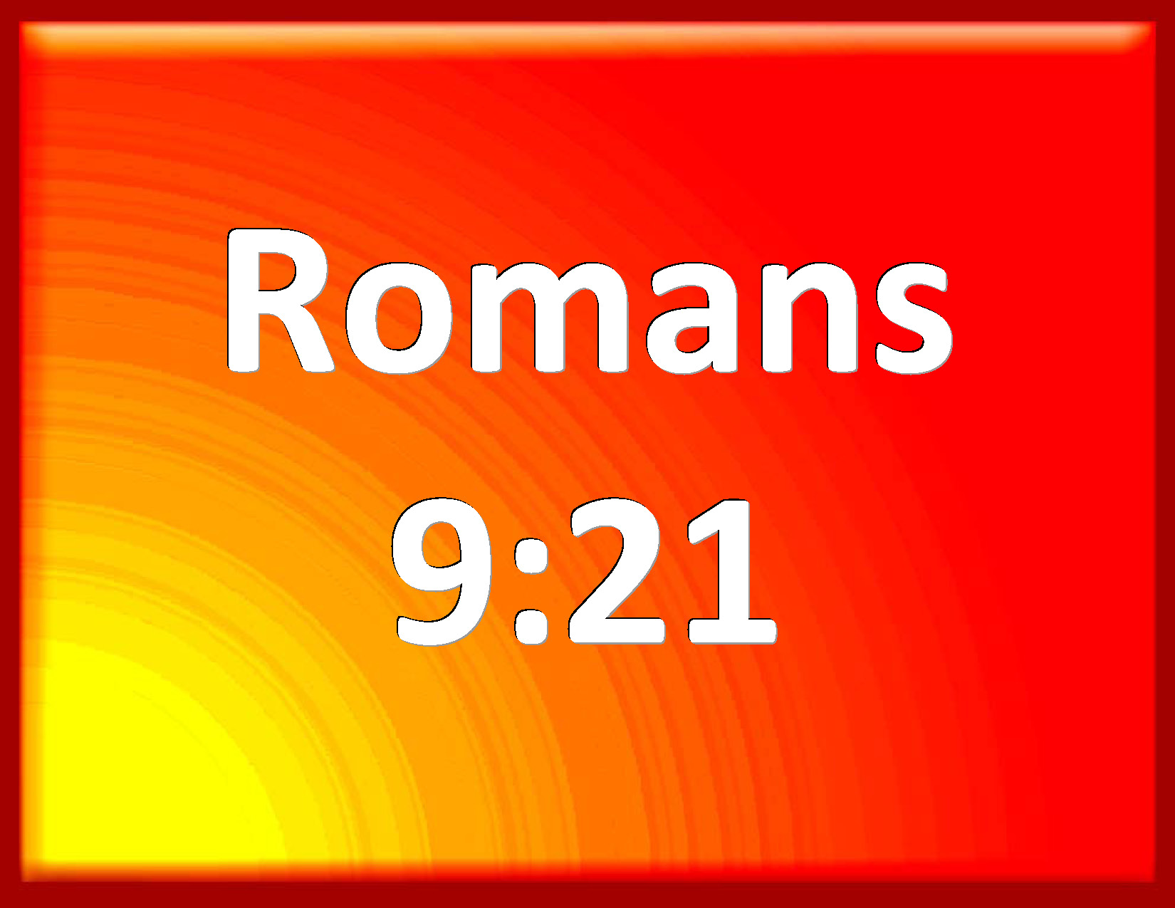Bible Verse Slide Romans 9:21 Has not the potter power over the clay, of the same lump to make one vessel to honor, and another to dishonor? KJV: Hath not the potter power over the clay, of the same lump to make one vessel unto honour, and another unto dishonour? DRB: Or hath not the potter power over the clay, of the same lump, to make one vessel unto honour, and another unto dishonour? DBT: Or has not the potter authority over the clay, out of the same lump to make one vessel to honour, and another to dishonour? ERV: Or hath not the potter a right over the clay, from the same lump to make one part a vessel unto honour, and another unto dishonour? WBT: Hath not the potter power over the clay of the same lump to make one vessel to honor, and another to dishonor? WEB: Or hasn't the potter a right over the clay, from the same lump to make one part a vessel for honor, and another for dishonor? YLT: hath not the potter authority over the clay, out of the same lump to make the one vessel to honour, and the one to dishonour?Links Romans 9:21 NIV • Romans 9:21 NLT • Romans 9:21 ESV • Romans 9:21 NASB • Romans 9:21 KJV • Romans 9:21 Interlinear • Romans 9:21 Commentaries • Romans 9:21 Parallel Texts • Romans 9:21 Bible Apps • Romans 9:21 Parallel • Bible Hub |