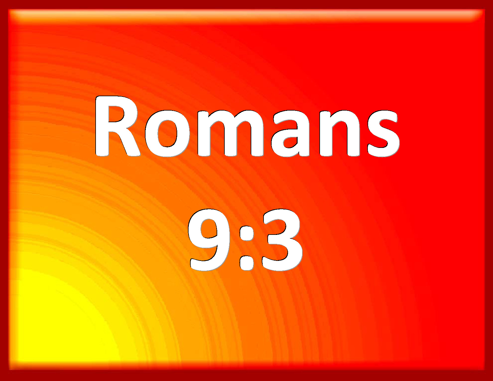 Bible Verse Slide Romans 9:3 For I could wish that myself were accursed from Christ for my brothers, my kinsmen according to the flesh: KJV: For I could wish that myself were accursed from Christ for my brethren, my kinsmen according to the flesh: DRB: For I wished myself to be an anathema from Christ, for my brethren, who are my kinsmen according to the flesh, DBT: for I have wished, I myself, to be a curse from the Christ for my brethren, my kinsmen, according to flesh; ERV: For I could wish that I myself were anathema from Christ for my brethren's sake, my kinsmen according to the flesh: WBT: For I could wish that myself were accursed from Christ, for my brethren, my kinsmen according to the flesh: WEB: For I could wish that I myself were accursed from Christ for my brothers' sake, my relatives according to the flesh, YLT: for I was wishing, I myself, to be anathema from the Christ — for my brethren, my kindred, according to the flesh,Links Romans 9:3 NIV • Romans 9:3 NLT • Romans 9:3 ESV • Romans 9:3 NASB • Romans 9:3 KJV • Romans 9:3 Interlinear • Romans 9:3 Commentaries • Romans 9:3 Parallel Texts • Romans 9:3 Bible Apps • Romans 9:3 Parallel • Bible Hub |