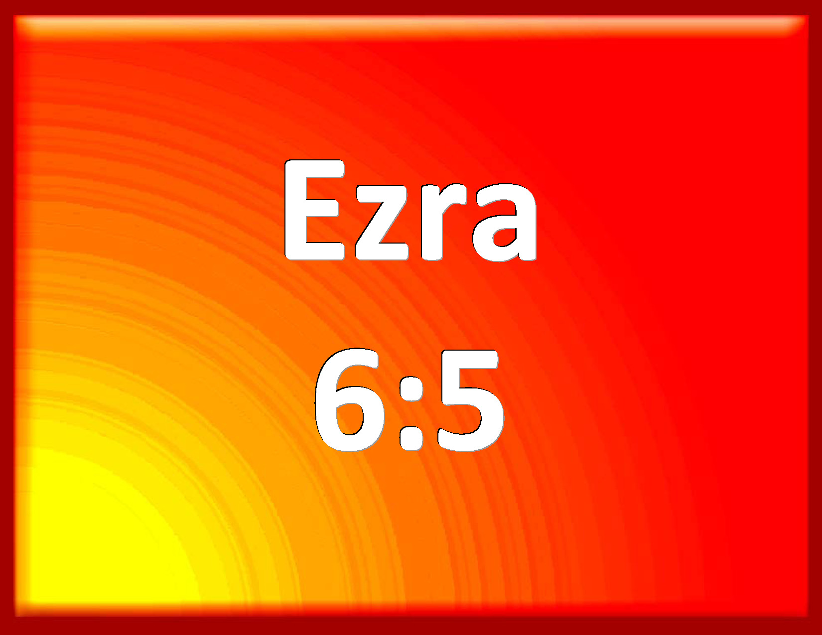 Bible Verse Slide Ezra 6:5 And also let the golden and silver vessels of the house of God, which Nebuchadnezzar took forth out of the temple which is at Jerusalem, and brought to Babylon, be restored, and brought again to the temple which is at Jerusalem, every one to his place, and place them in the house of God. KJV: And also let the golden and silver vessels of the house of God, which Nebuchadnezzar took forth out of the temple which is at Jerusalem, and brought unto Babylon, be restored, and brought again unto the temple which is at Jerusalem, every one to his place, and place them in the house of God. DRB: And also let the golden and silver vessels of the temple of Cod, which Nabuchodonosor took out of the temple of Jerusalem, and brought to Babylon, be restored, and carried back to the temple of Jerusalem to their place, which also were placed in the temple of God. DBT: and also let the golden and silver vessels of the house of God, which Nebuchadnezzar took out of the temple that is at Jerusalem and brought to Babylon, be restored and brought again to the temple that is at Jerusalem, in their place; and thou shalt put them in the house of God. ERV: And also let the gold and silver vessels of the house of God, which Nebuchadnezzar took forth out of the temple which is at Jerusalem, and brought unto Babylon, be restored, and brought again unto the temple which is at Jerusalem, every one to its place, and thou shalt put them in the house of God. WBT: And also let the golden and silver vessels of the house of God, which Nebuchadnezzar took out of the temple which is at Jerusalem, and brought to Babylon, be restored, and brought again to the temple which is at Jerusalem, every one to its place, and place them in the house of God. WEB: Also let the gold and silver vessels of the house of God, which Nebuchadnezzar took forth out of the temple which is at Jerusalem, and brought to Babylon, be restored, and brought again to the temple which is at Jerusalem, everyone to its place; and you shall put them in the house of God. YLT: And also, the vessels of the house of God, of gold and silver, that Nebuchadnezzar took forth out of the temple that is in Jerusalem, and brought to Babylon, let be given back, and go to the temple that is in Jerusalem, each to its place, and put them down in the house of God.Links Ezra 6:5 NIV • Ezra 6:5 NLT • Ezra 6:5 ESV • Ezra 6:5 NASB • Ezra 6:5 KJV • Ezra 6:5 Interlinear • Ezra 6:5 Commentaries • Ezra 6:5 Parallel Texts • Ezra 6:5 Bible Apps • Ezra 6:5 Parallel • Bible Hub |