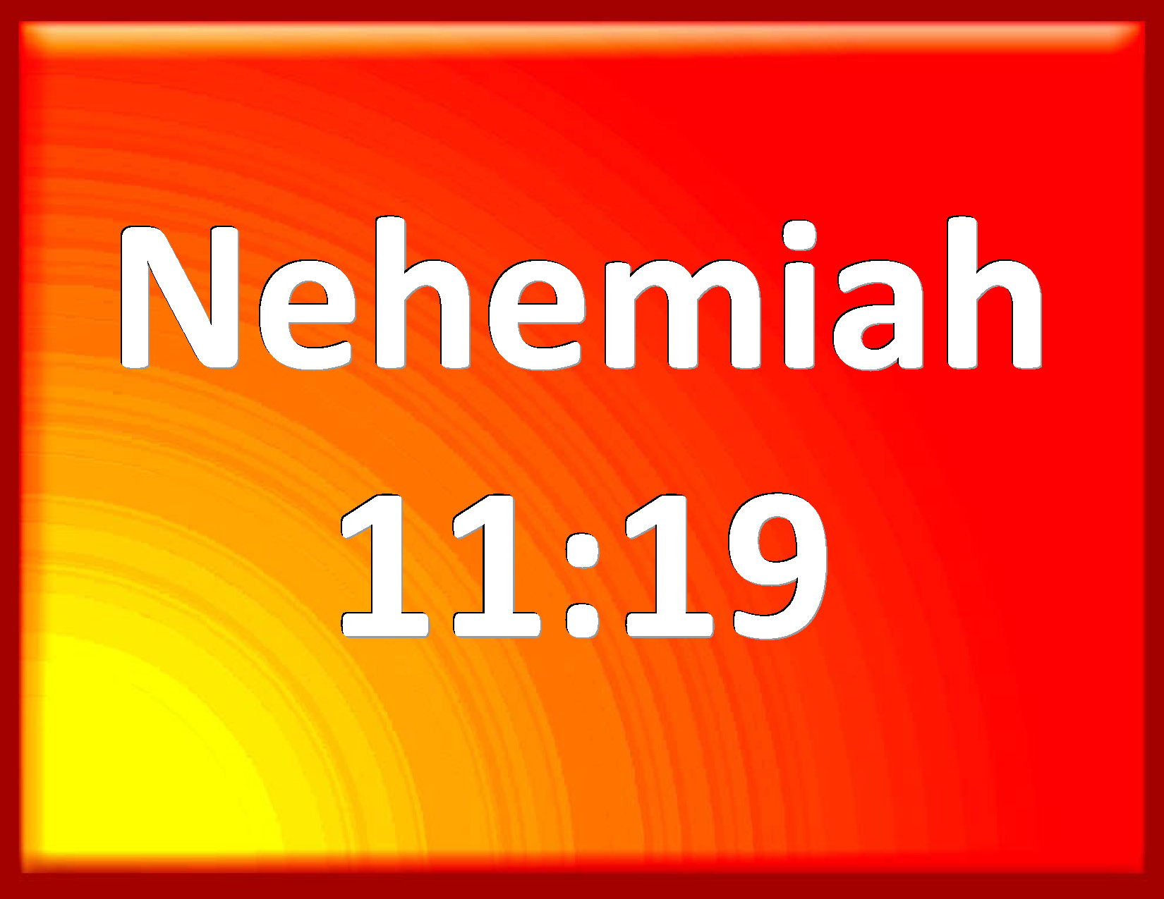 Bible Verse Slide Nehemiah 11:19 Moreover the porters, Akkub, Talmon, and their brothers that kept the gates, were an hundred seventy and two. KJV: Moreover the porters, Akkub, Talmon, and their brethren that kept the gates, were an hundred seventy and two. DRB: And the porters, Accub, Telmon, and their brethren, who kept the doors: a hundred seventy-two. DBT: And the doorkeepers, Akkub, Talmon, and their brethren, that kept watch at the gates, were a hundred and seventy-two. ERV: Moreover the porters, Akkub, Talmon, and their brethren, that kept watch at the gates, were an hundred seventy and two. WBT: Moreover the porters, Akkub, Talmon, and their brethren that kept the gates, were an hundred and seventy two. WEB: Moreover the porters, Akkub, Talmon, and their brothers, who kept watch at the gates, were one hundred seventy-two. YLT: And the gatekeepers, Akkub, Talmon, and their brethren, those watching at the gates, are a hundred seventy and two.Links Nehemiah 11:19 NIV • Nehemiah 11:19 NLT • Nehemiah 11:19 ESV • Nehemiah 11:19 NASB • Nehemiah 11:19 KJV • Nehemiah 11:19 Interlinear • Nehemiah 11:19 Commentaries • Nehemiah 11:19 Parallel Texts • Nehemiah 11:19 Bible Apps • Nehemiah 11:19 Parallel • Bible Hub |