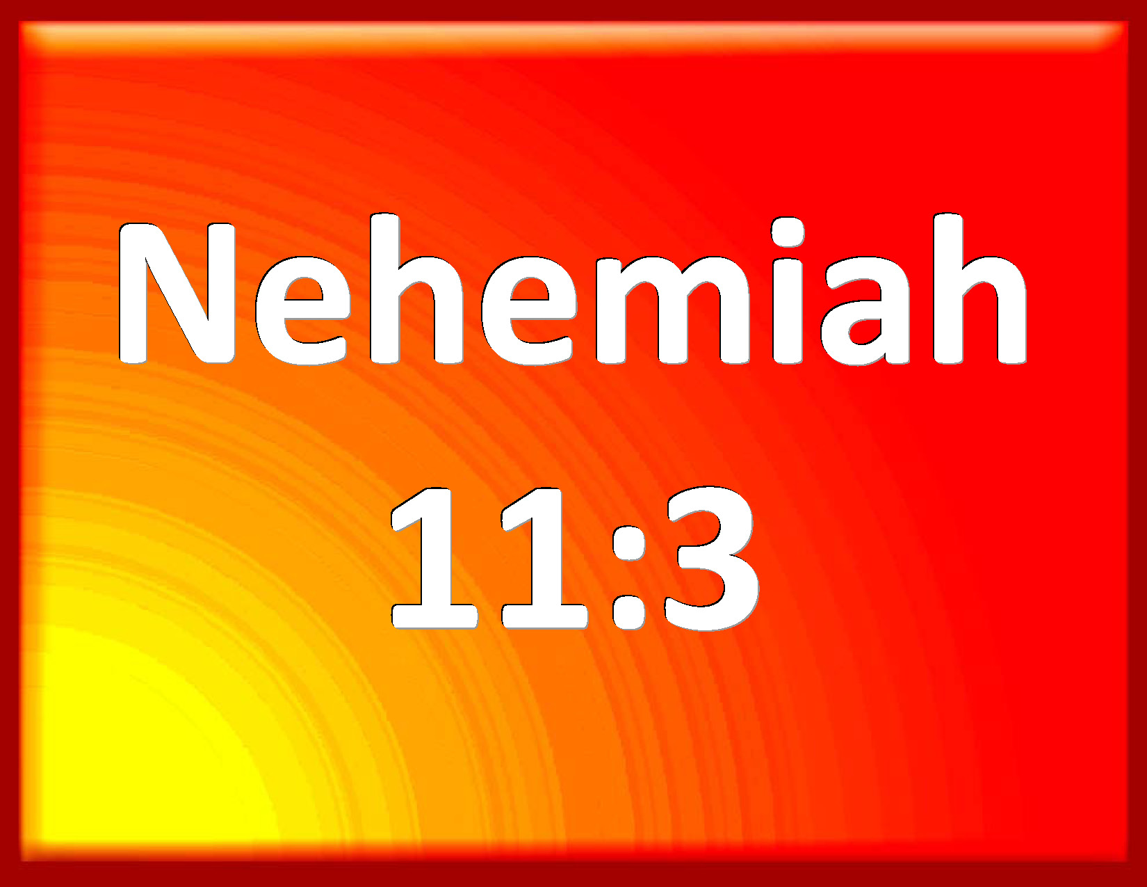 Bible Verse Slide Nehemiah 11:3 Now these are the chief of the province that dwelled in Jerusalem: but in the cities of Judah dwelled every one in his possession in their cities, to wit, Israel, the priests, and the Levites, and the Nethinims, and the children of Solomon's servants. KJV: Now these are the chief of the province that dwelt in Jerusalem: but in the cities of Judah dwelt every one in his possession in their cities, to wit, Israel, the priests, and the Levites, and the Nethinims, and the children of Solomon's servants. DRB: These therefore are the chief men of the province, who dwelt in Jerusalem, and in the cities of Juda. And every one dwelt in his possession, in their cities: Israel, the priests, the Levites, the Nathinites, and the children of the servants of Solomon. DBT: And these are the chiefs of the province that dwelt in Jerusalem; but in the cities of Judah dwelt every one in his possession in their cities, Israel, the priests, and the Levites, and the Nethinim, and the children of Solomon's servants. ERV: Now these are the chiefs of the province that dwelt in Jerusalem: but in the cities of Judah dwelt every one in his possession in their cities, to wit, Israel, the priests, and the Levites, and the Nethinim, and the children of Solomon's servants. WBT: Now these are the chief of the province that dwelt in Jerusalem: but in the cities of Judah dwelt every one in his possession in their cities, to wit, Israel, the priests, and the Levites, and the Nethinims, and the children of Solomon's servants. WEB: Now these are the chiefs of the province who lived in Jerusalem: but in the cities of Judah lived everyone in his possession in their cities, [to wit], Israel, the priests, and the Levites, and the Nethinim, and the children of Solomon's servants. YLT: And these are heads of the province who have dwelt in Jerusalem, and in cities of Judah, they have dwelt each in his possession in their cities; Israel, the priests, and the Levites, and the Nethinim, and the sons of the servants of Solomon.Links Nehemiah 11:3 NIV • Nehemiah 11:3 NLT • Nehemiah 11:3 ESV • Nehemiah 11:3 NASB • Nehemiah 11:3 KJV • Nehemiah 11:3 Interlinear • Nehemiah 11:3 Commentaries • Nehemiah 11:3 Parallel Texts • Nehemiah 11:3 Bible Apps • Nehemiah 11:3 Parallel • Bible Hub |